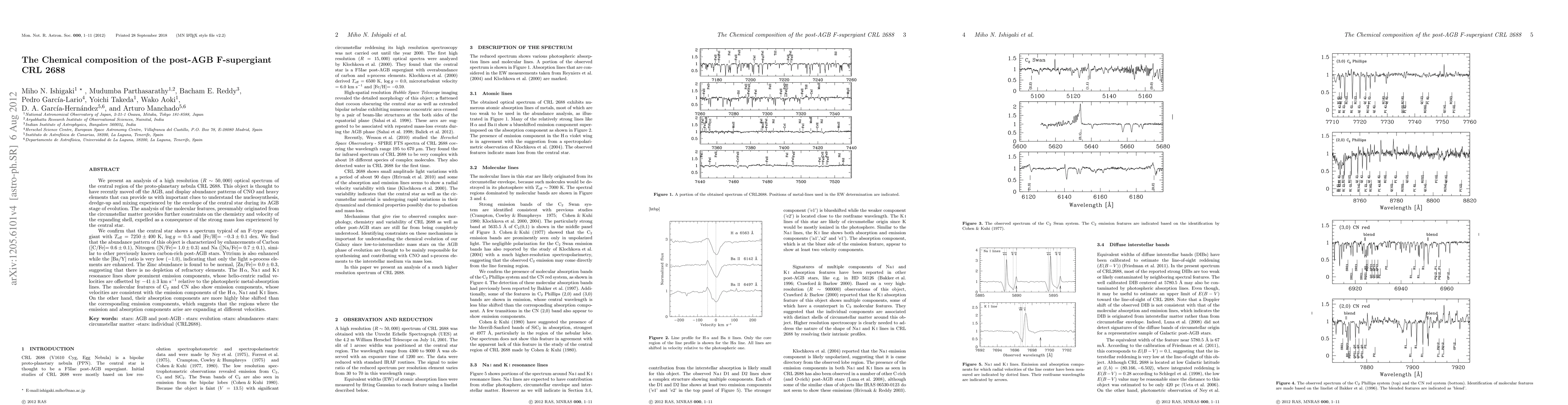 The research analyzes the high-resolution optical spectrum of post-AGB F-supergiant CRL 2688, confirming its F-type supergiant characteristics with Teff=7250 K, log g=0.5, and [Fe/H]=-0.3 dex. Key findings include enhancements of C ([C/Fe]=0.6), N ([N/Fe]=1.0), Na ([Na/Fe]=0.7), and Yttrium, while Ba/Y ratio indicates only light s-process enrichment. Zinc abundance is normal, suggesting no refractory element depletion. Emission components in Halpha, Na I, K I, C_2, and CN lines reveal offset velocities, implying different expansion velocities for emission and absorption regions.