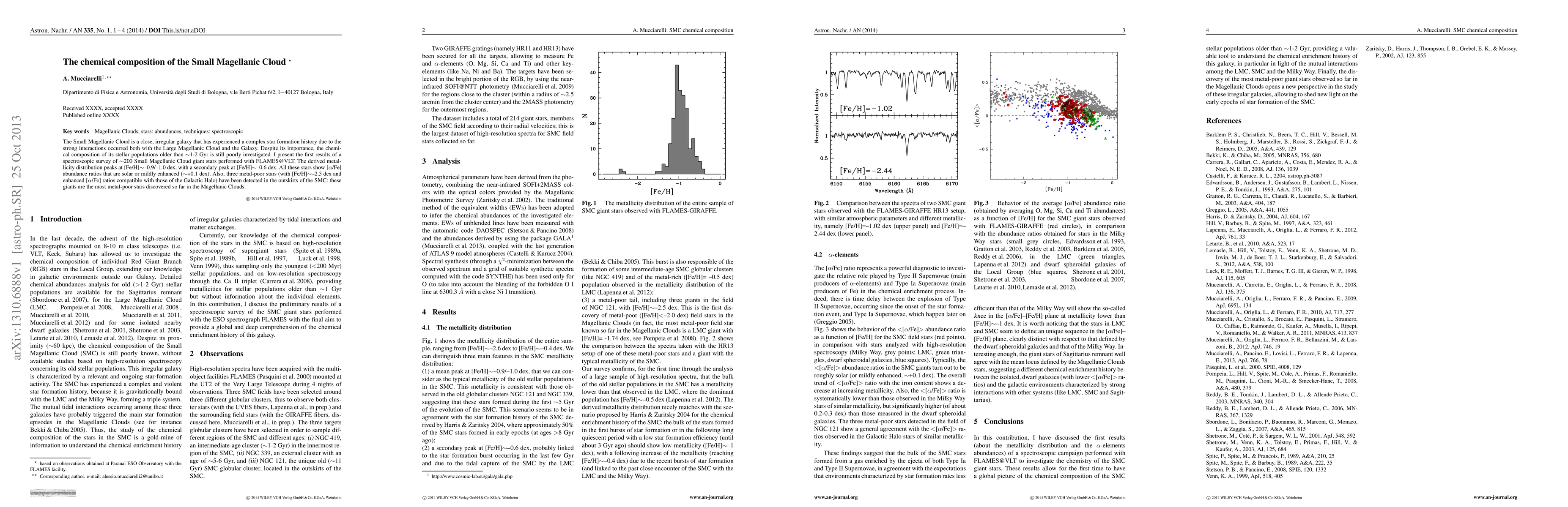 The Small Magellanic Cloud is a close, irregular galaxy that has experienced a complex star formation history due to the strong interactions occurred both with the Large Magellanic Cloud and the Galaxy. Despite its importance, the chemical composition of its stellar populations older than 1-2 Gyr is still poorly investigated. I present the first results of a spectroscopic survey of 200 Small Magellanic Cloud giant stars performed with FLAMES@VLT. The derived metallicity distribution peaks at [Fe/H] -0.9/-1.0 dex, with a secondary peak at [Fe/H] -0.6 dex. All these stars show [alpha/Fe] abundance ratios that are solar or mildly enhanced (+0.1 dex). Also, three metal-poor stars (with [Fe/H] -2.5 dex and enhanced [alpha/Fe] ratios compatible with those of the Galactic Halo) have been detected in the outskirts of the SMC: these giants are the most metal-poor stars discovered so far in the Magellanic Clouds.