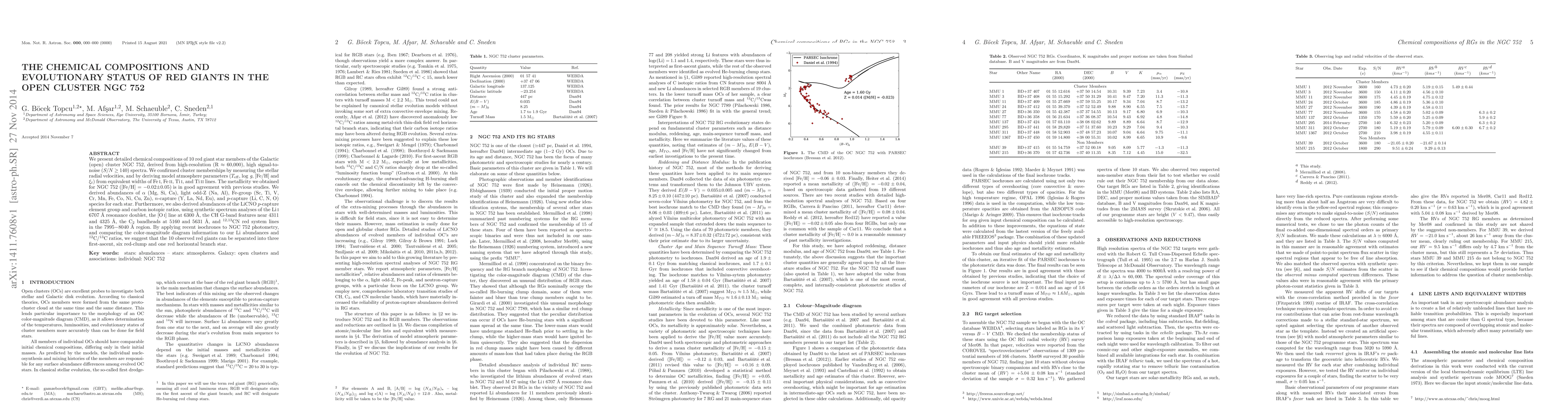This paper provides detailed chemical compositions of 10 red giant stars in the open cluster NGC 752, derived from high-resolution spectra. The study confirms cluster membership and categorizes the stars into three evolutionary stages based on their Li abundances, carbon isotopic ratios, and color-magnitude diagram.