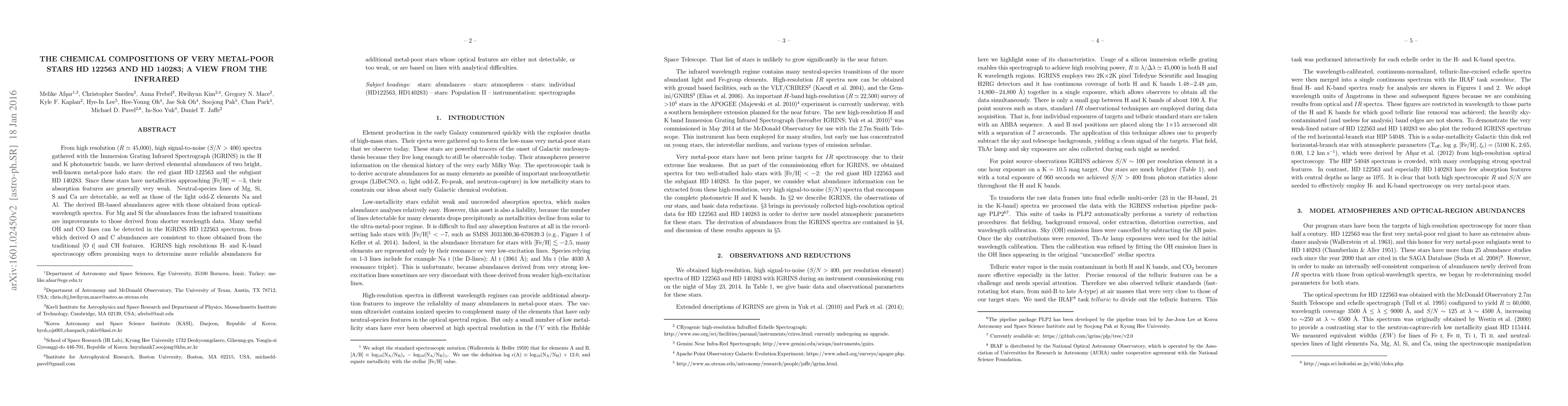 This study uses high-resolution infrared spectroscopy to determine the chemical compositions of two very metal-poor stars, HD 122563 and HD 140283, revealing detectable elemental abundances of Mg, Si, S, Ca, Na, and Al. The derived infrared abundances match those from optical spectra, indicating a promising method for studying additional metal-poor stars with weak optical features.