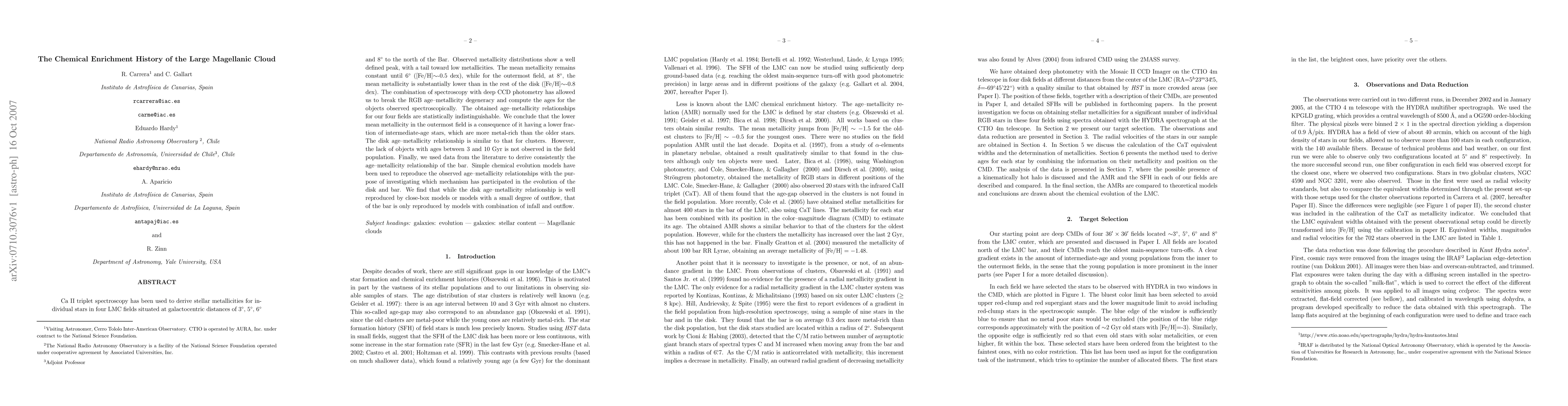 Ca II triplet spectroscopy has been used to derive stellar metallicities for individual stars in four LMC fields situated at galactocentric distances of 3\arcdeg, 5\arcdeg, 6\arcdeg\@ and 8\arcdeg\@ to the north of the Bar. Observed metallicity distributions show a well defined peak, with a tail toward low metallicities. The mean metallicity remains constant until 6\arcdeg\@ ([Fe/H]$\sim$-0.5 dex), while for the outermost field, at 8\arcdeg, the mean metallicity is substantially lower than in the rest of the disk ([Fe/H]$\sim$-0.8 dex). The combination of spectroscopy with deep CCD photometry has allowed us to break the RGB age--metallicity degeneracy and compute the ages for the objects observed spectroscopically. The obtained age--metallicity relationships for our four fields are statistically indistinguishable. We conclude that the lower mean metallicity in the outermost field is a consequence of it having a lower fraction of intermediate-age stars, which are more metal-rich than the older stars. The disk age--metallicity relationship is similar to that for clusters. However, the lack of objects with ages between 3 and 10 Gyr is not observed in the field population. Finally, we used data from the literature to derive consistently the age--metallicity relationship of the bar. Simple chemical evolution models have been used to reproduce the observed age--metallicity relationships with the purpose of investigating which mechanism has participated in the evolution of the disk and bar. We find that while the disk age--metallicity relationship is well reproduced by close-box models or models with a small degree of outflow, that of the bar is only reproduced by models with combination of infall and outflow.