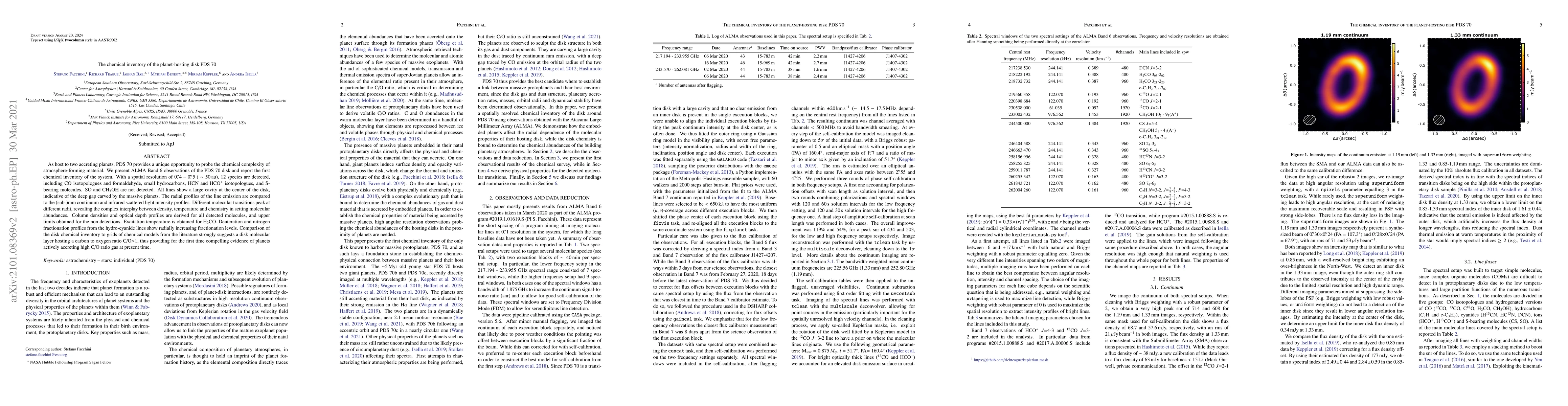 This study provides the first chemical inventory of the planet-hosting disk PDS 70 using ALMA observations, detecting 12 species including CO isotopologues and S-bearing molecules. The findings reveal a complex interplay between density, temperature, and chemistry in the disk, with evidence suggesting a high C/O ratio indicative of active planet accretion.