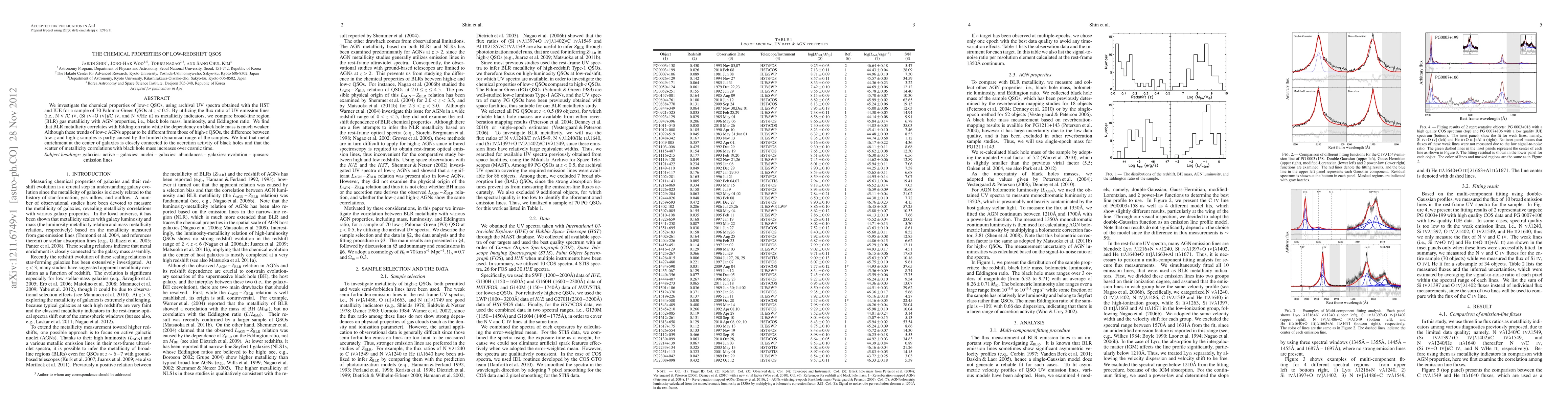 We investigate the chemical properties of low-z QSOs, using archival UV spectra obtained with the HST and IUE for a sample of 70 Palomar-Green QSOs at z < 0.5. By utilizing the flux ratio of UV emission lines (i.e., NV /CIV, (SiIV+OIV])/CIV, and NV/HeII) as metallicity indicators, we compare broad-line region (BLR) gas metallicity with AGN properties, i.e., black hole mass, luminosity, and Eddington ratio. We find that BLR metallicity correlates with Eddington ratio while the dependency on black hole mass is much weaker. Although these trends of low-z AGNs appear to be different from those of high-z QSOs, the difference between low-z and high-z samples is partly caused by the limited dynamical range of the samples. We find that metal enrichment at the center of galaxies is closely connected to the accretion activity of black holes and that the scatter of metallicity correlations with black hole mass increases over cosmic time.
