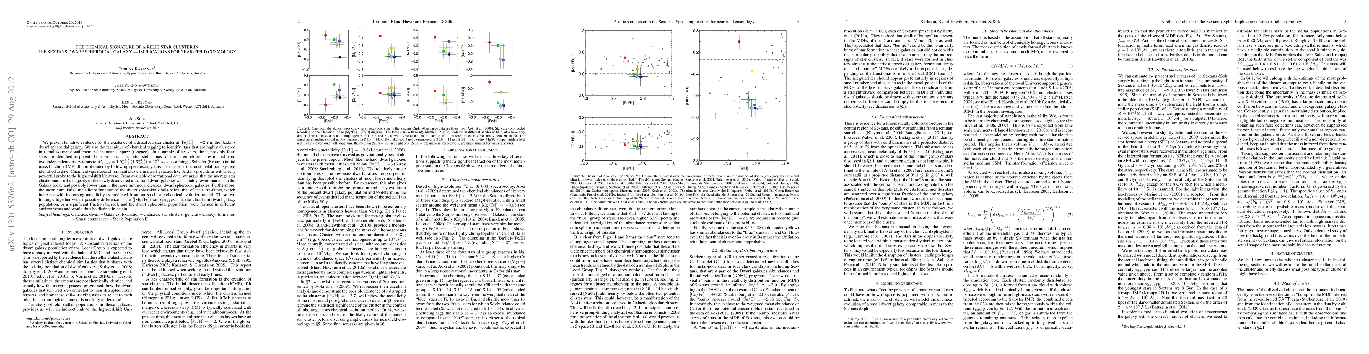 We present tentative evidence for the existence of a dissolved star cluster at [Fe/H]=-2.7 in the Sextans dwarf spheroidal galaxy. We use the technique of chemical tagging to identify stars that are highly clustered in a multi-dimensional chemical abundance space (C-space). In a sample of six stars, three, possibly four stars are identified as potential cluster stars. The initial stellar mass of the parent cluster is estimated from two independent observations to M*,init=1.9^{+1.5}_{-0.9} (1.6^{+1.2}_{-0.8}) x 10^5 M_sol, assuming a Salpeter (Kroupa) initial mass function (IMF). If corroborated by follow-up spectroscopy, this star cluster is the most metal-poor system identified to date. Chemical signatures of remnant clusters in dwarf galaxies like Sextans provide us with a very powerful probe to the high-redshift Universe. From available observational data, we argue that the average star cluster mass in the majority of the newly discovered ultra-faint dwarf galaxies was notably lower than it is in the Galaxy today and possibly lower than in the more luminous, classical dwarf spheroidal galaxies. Furthermore, the mean cumulative metallicity function of the dwarf spheroidals falls below that of the ultra-faints, which increases with increasing metallicity as predicted from our stochastic chemical evolution model. These two findings, together with a possible difference in the <[Mg/Fe]> ratio suggest that the ultra-faint dwarf galaxy population, or a significant fraction thereof, and the dwarf spheroidal population, were formed in different environments and would thus be distinct in origin.