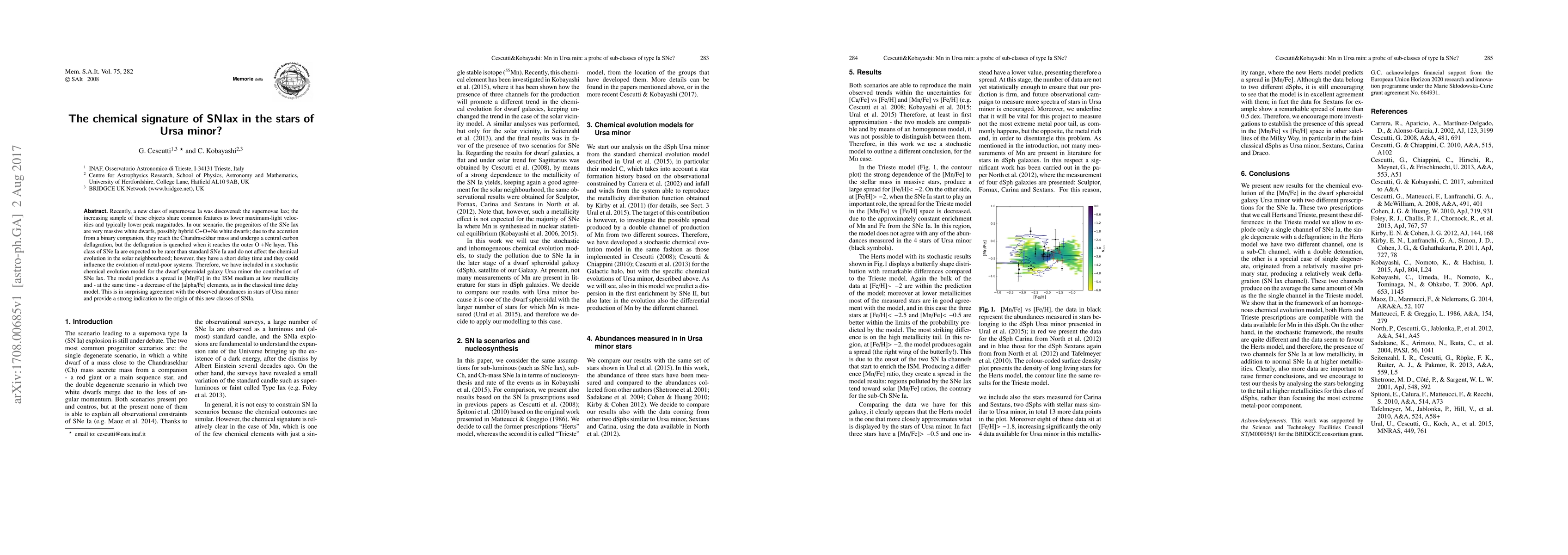 This paper explores the chemical signature of supernovae Iax (SNe Iax) in the stars of Ursa minor, proposing that these rare, quenched carbon deflagration events influence the galaxy's metal-poor system's evolution. The stochastic chemical evolution model predicts a spread in [Mn/Fe] and a decrease in [alpha/Fe] elements, aligning with observed abundances in Ursa minor stars.