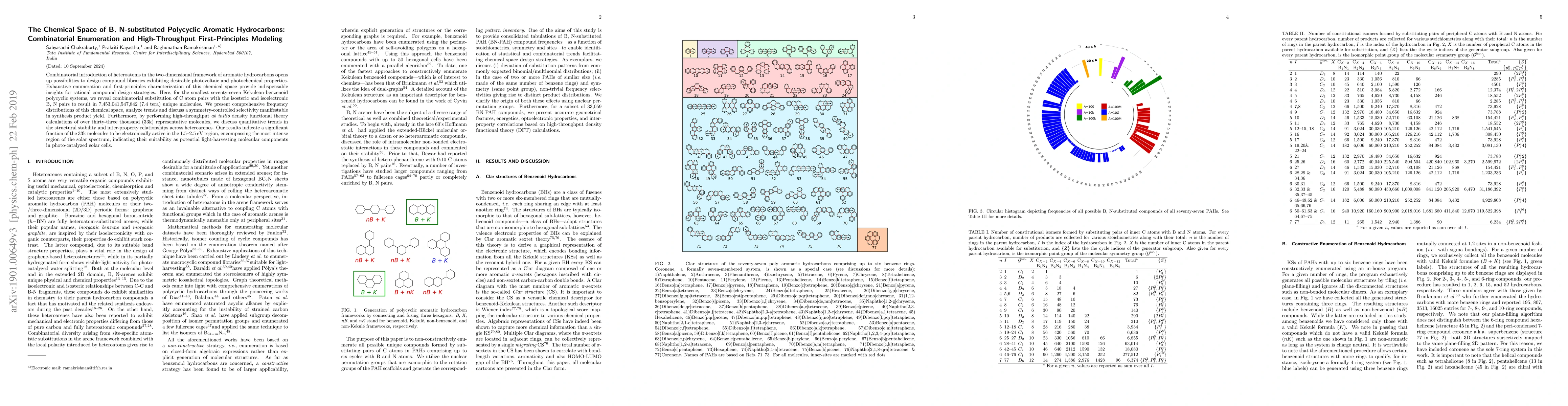 This paper explores the vast combinatorial space of B, N-substituted polycyclic aromatic hydrocarbons, revealing 7.4 tera unique molecules through exhaustive enumeration. High-throughput DFT calculations on 33k representative molecules highlight structural stability and potential photovoltaic properties, indicating many are electronically active in the solar spectrum, suggesting their use in photo-catalyzed solar cells.