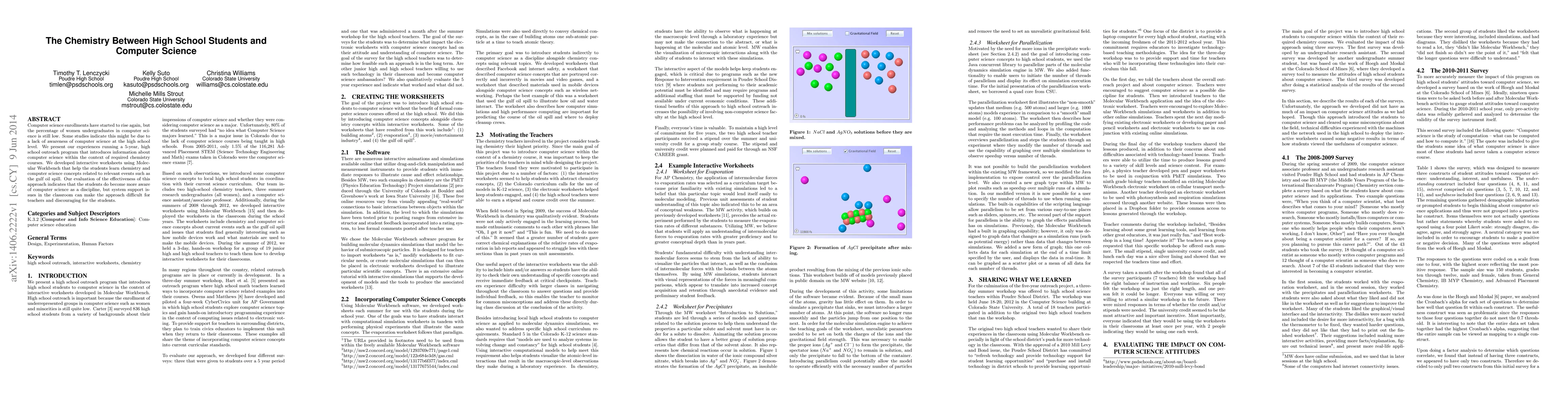 Computer science enrollments have started to rise again, but the percentage of women undergraduates in computer science is still low. Some studies indicate this might be due to a lack of awareness of computer science at the high school level. We present our experiences running a 5-year, high school outreach program that introduces information about computer science within the context of required chemistry courses. We developed interactive worksheets using Molecular Workbench that help the students learn chemistry and computer science concepts related to relevant events such as the gulf oil spill. Our evaluation of the effectiveness of this approach indicates that the students do become more aware of computer science as a discipline, but system support issues in the classroom can make the approach difficult for teachers and discouraging for the students.