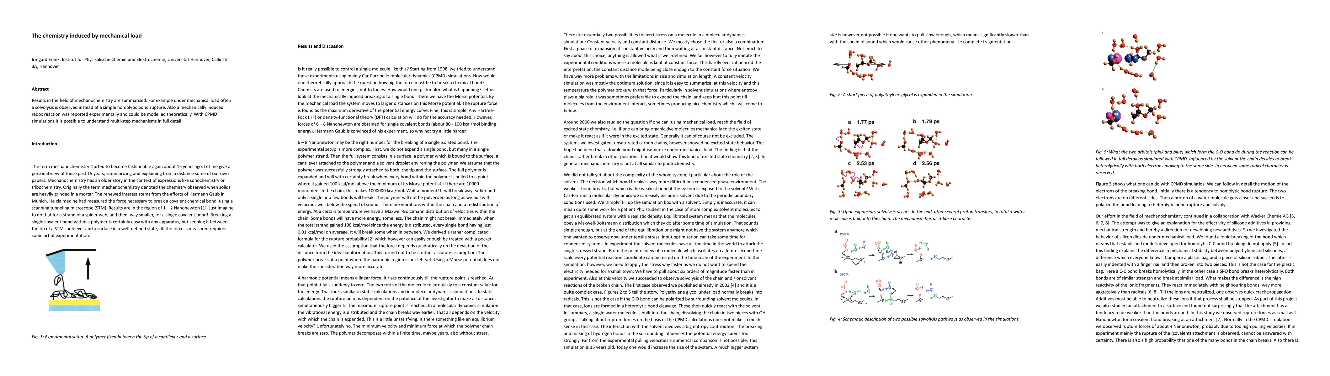This paper reviews mechanochemistry, highlighting how mechanical load induces solvolysis and redox reactions instead of simple homolytic bond ruptures, and uses CPMD simulations to detail multi-step reaction mechanisms.