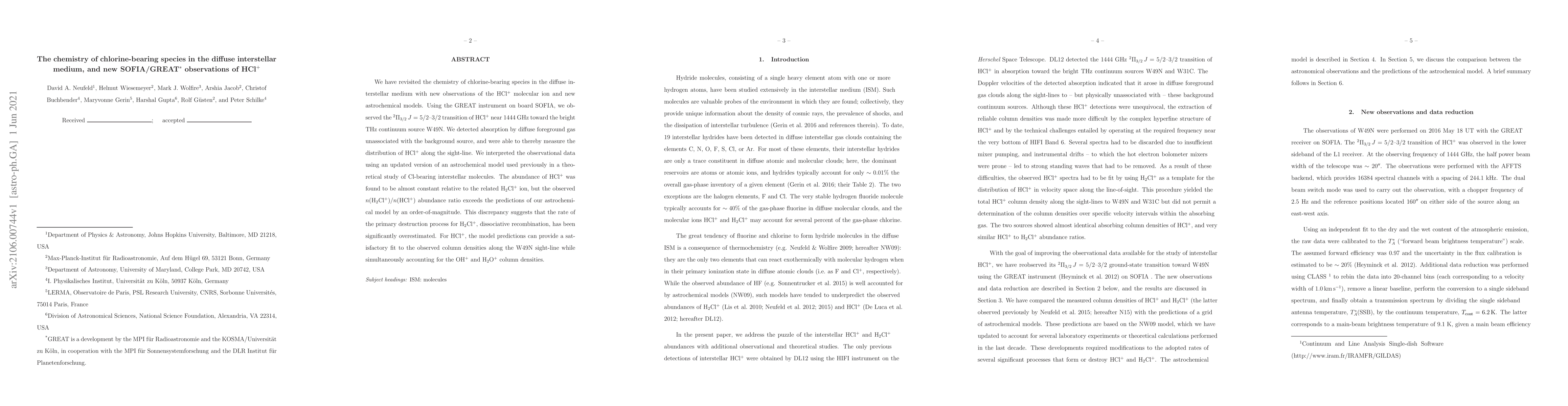 This paper revisits the chemistry of chlorine-bearing species in the diffuse interstellar medium using new SOFIA/GREAT observations of HCl$^+$. The study detected HCl$^+$ absorption and found its abundance relative to H$_2$Cl$^+$, revealing a significant discrepancy between observed and modeled abundance ratios for H$_2$Cl$^+$, suggesting an overestimation of its destruction rate.