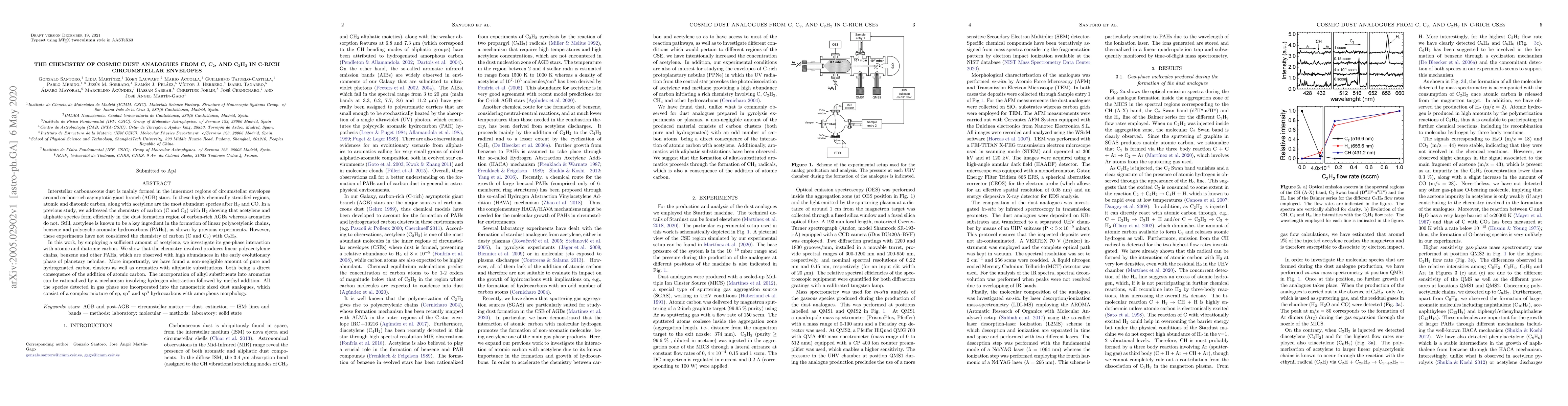 This study investigates the chemistry of carbonaceous dust analogues formed from C, C$_2$, and C$_2$H$_2$ in carbon-rich circumstellar envelopes, revealing the formation of linear polyacetylenic chains, benzene, and PAHs, alongside significant amounts of pure and hydrogenated carbon clusters and aromatics with aliphatic substitutions. The dust analogues consist of a complex mixture of hydrocarbons with amorphous morphology.