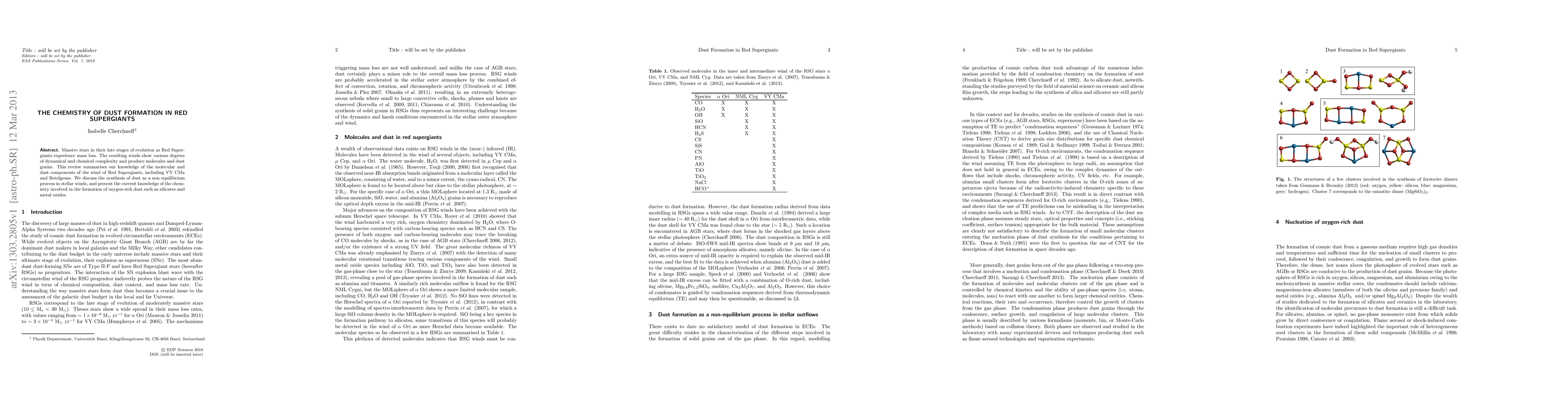 This paper reviews the complex chemistry and dynamics of dust formation in the winds of red supergiant stars, focusing on the synthesis of oxygen-rich dust grains like silicates and metal oxides, and highlighting the non-equilibrium processes involved in the production of these materials.