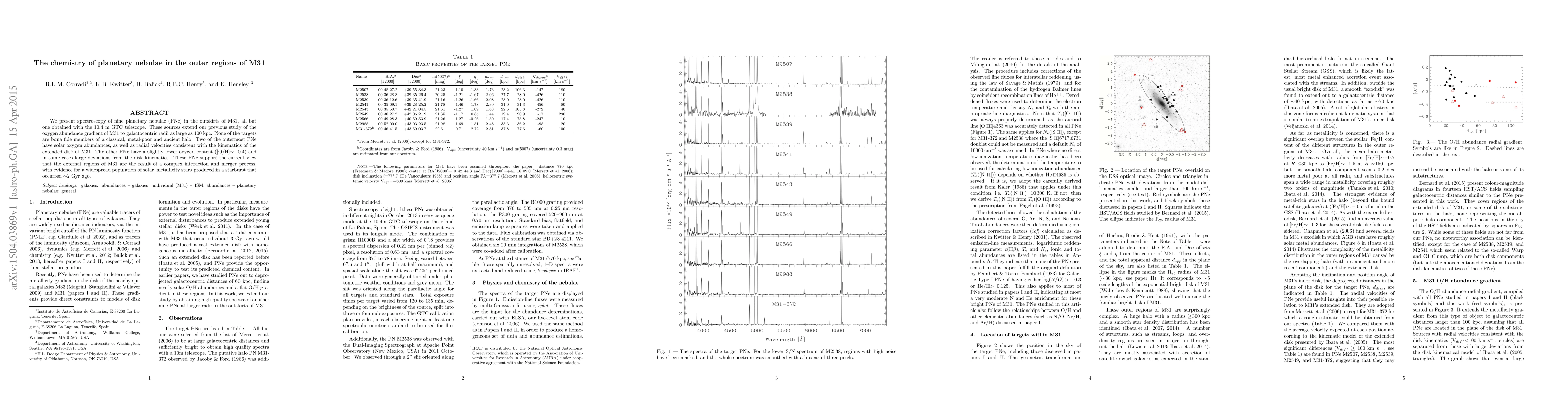 This study uses spectroscopy to analyze nine planetary nebulae in the outskirts of M31, revealing a complex chemical composition gradient. Two of the outermost nebulae exhibit solar oxygen abundances, suggesting a recent starburst event ~2 Gyr ago, while others show slightly lower oxygen content and kinematic deviations indicative of a merger-driven formation history.