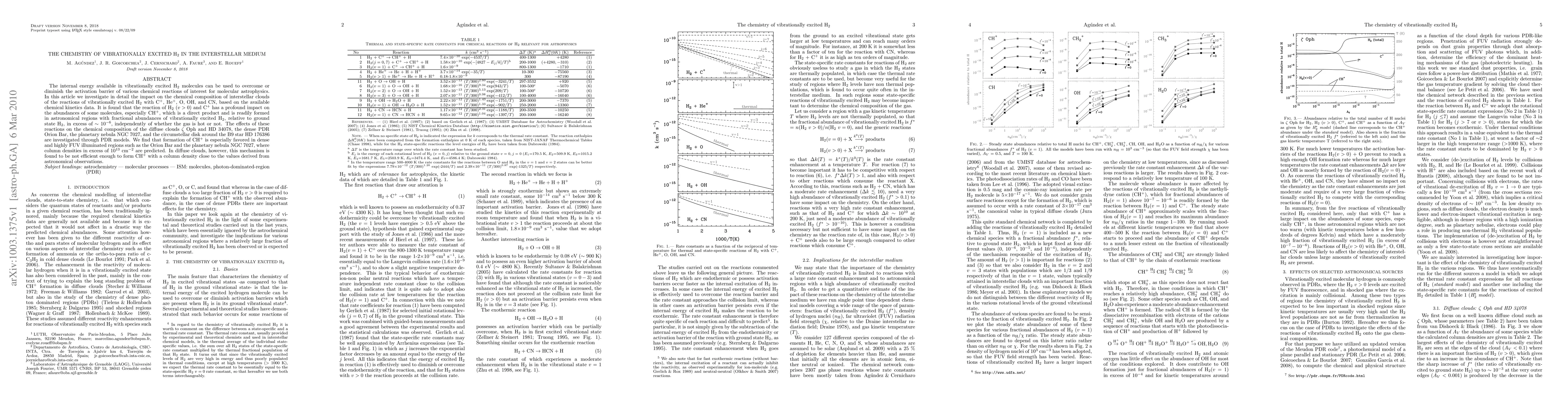 This paper investigates how reactions involving vibrationally excited H2 molecules affect the chemical composition of interstellar clouds. It finds that the reaction between H2 (v>0) and C+ significantly boosts the formation of CH+, especially in dense, highly FUV illuminated regions like the Orion Bar and NGC 7027.