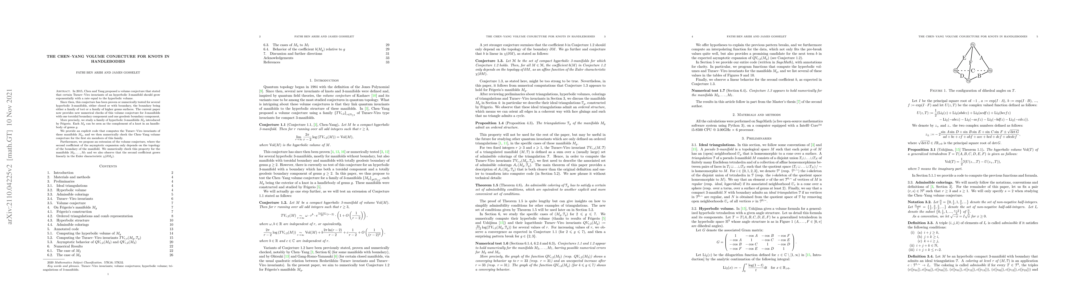 In 2015, Chen and Yang proposed a volume conjecture that stated that certain Turaev-Viro invariants of an hyperbolic 3-manifold should grow exponentially with a rate equal to the hyperbolic volume. Since then, this conjecture has been proven or numerically tested for several hyperbolic 3-manifolds, either closed or with boundary, the boundary being either a family of tori or a family of higher genus surfaces. The current paper now provides new numerical checks of this volume conjecture for 3-manifolds with one toroidal boundary component and one geodesic boundary component. More precisely, we study a family of hyperbolic 3-manifolds $M_g$ introduced by Frigerio. Each $M_g$ can be seen as the complement of a knot in an handlebody of genus $g$. We provide an explicit code that computes the Turaev-Viro invariants of these manifolds $M_g$, and we then numerically check the Chen-Yang volume conjecture for the first six members of this family. Furthermore, we propose an extension of the volume conjecture, where the second coefficient of the asymptotic expansion only depends on the topology of the boundary of the manifold. We numerically check this property for the manifolds $M_2$ to $M_7$ and we also observe that the second coefficient grows linearly in the Euler characteristic $\chi(\partial M_g)$.