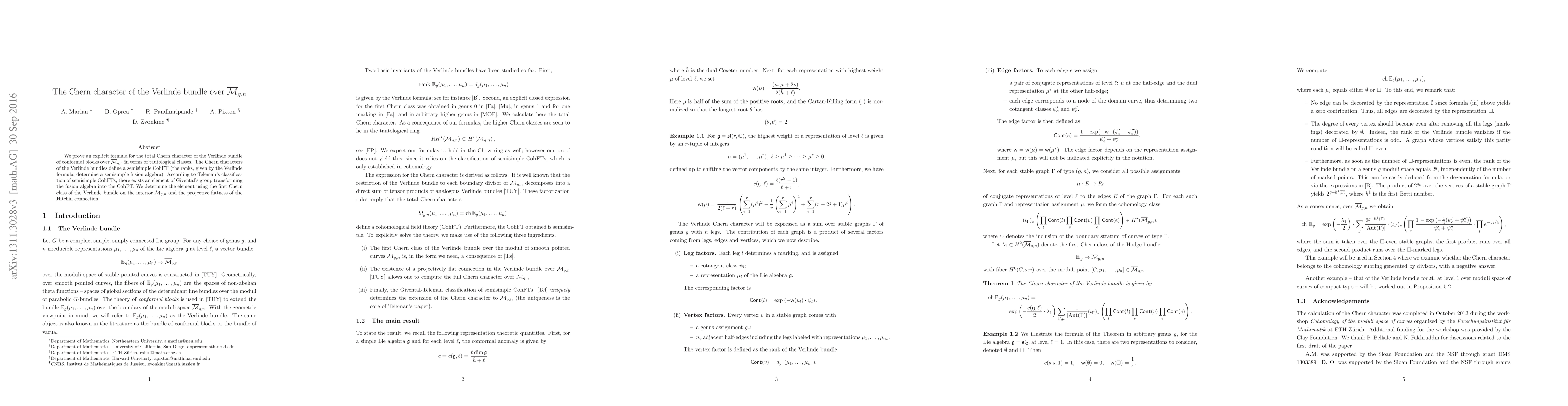 Summary: This paper provides an explicit formula for the total Chern character of the Verlinde bundle over the moduli space of stable curves, linking it to tautological classes and demonstrating its role in a semisimple CohFT, determined by an element of Givental's group via the first Chern class and the projective flatness of the Hitchin connection.