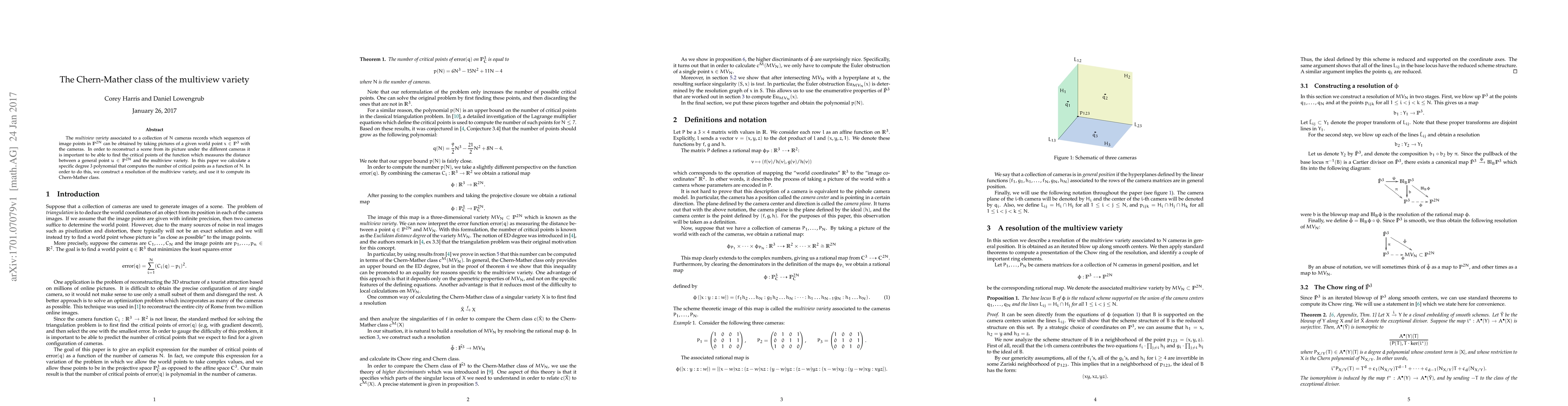 This paper calculates a degree 3 polynomial to determine the number of critical points of a function measuring the distance between a general point and the multiview variety associated with $N$ cameras. It achieves this by constructing a resolution of the multiview variety and computing its Chern-Mather class.