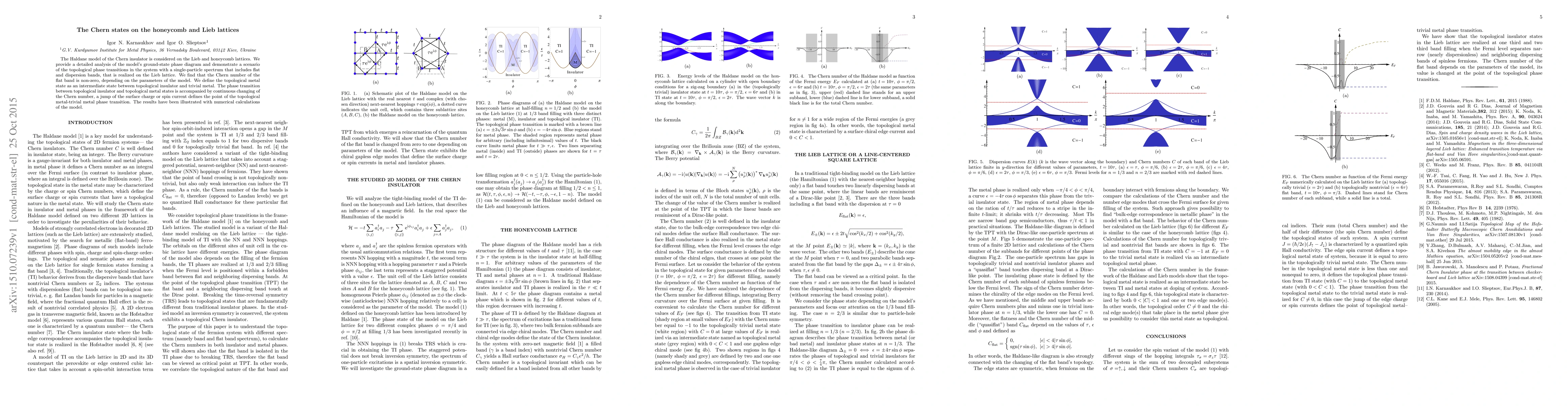 The Haldane model of the Chern insulator is considered on the Lieb and honeycomb lattices. We provide a detailed analysis of the model's ground-state phase diagram and demonstrate a scenario of the topological phase transitions in the system with a single-particle spectrum that includes flat and dispersion bands, that is realized on the Lieb lattice. We find that the Chern number of the flat band is non-zero, depending on the parameters of the model. We define the topological metal state as an intermediate state between topological insulator and trivial metal. The phase transition between topological insulator and topological metal states is accompanied by continuous changing of the Chern number, a jump of the surface charge or spin current defines the point of the topological metal-trivial metal phase transition. The results have been illustrated with numerical calculations of the model.