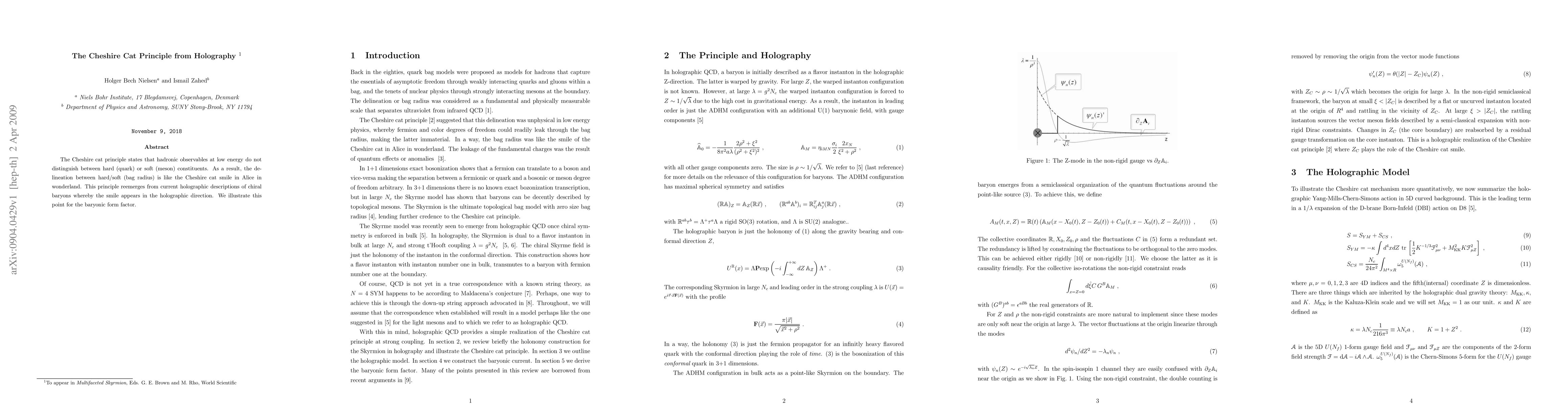The Cheshire Cat Principle suggests that low-energy hadronic observables do not differentiate between quark and meson components. Holographic models reveal this principle by showing the "smile" of the Cheshire cat in the holographic direction, exemplified through baryonic form factors.