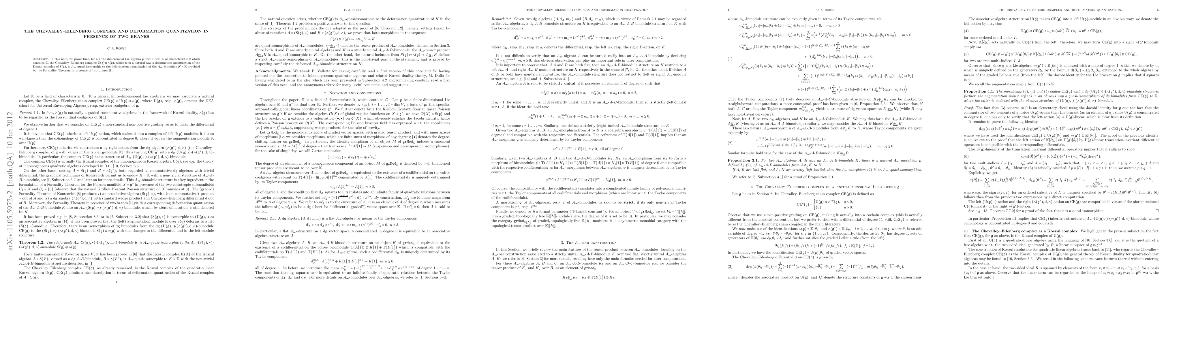 In this note, we prove that, for a finite-dimensional Lie algebra $\mathfrak g$ over a field $\mathbb K$ of characteristic 0 which contains $\mathbb C$, the Chevalley--Eilenberg complex $\mathrm U(\mathfrak g)\otimes \wedge(\mathfrak g)$, which is in a natural way a deformation quantization of the Koszul complex of $\mathrm S(\mathfrak g)$, is $A_\infty$-quasi-isomorphic to the deformation quantization of the $A_\infty$-bimodule $K=\mathbb K$ provided by the Formality Theorem in presence of two branes (CFFR).