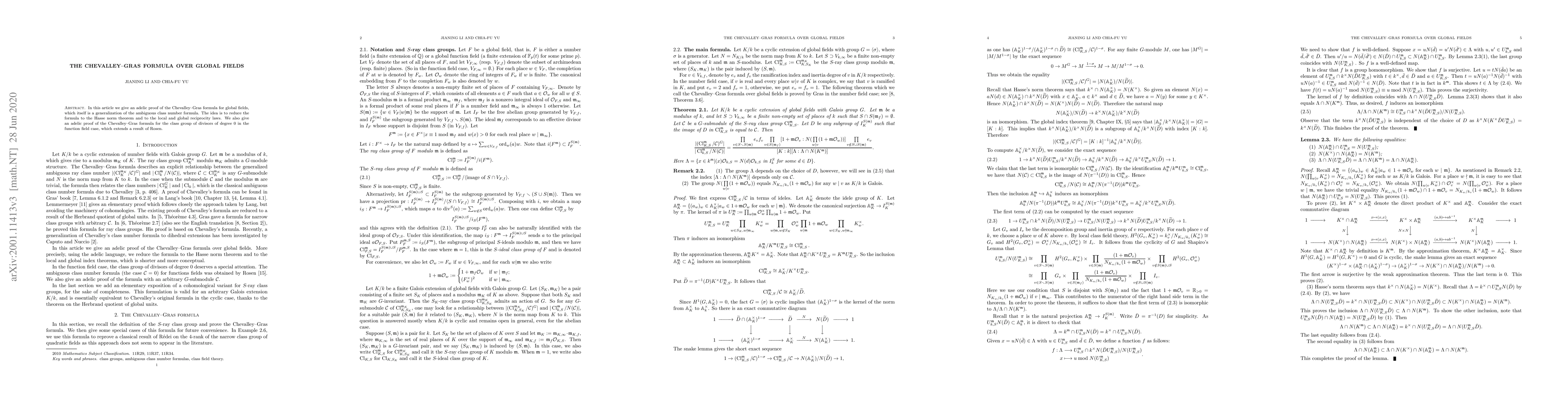 This paper presents an adelic proof of the Chevalley-Gras formula for global fields, generalizing the ambiguous class number formula, and extends Rosen's result for the $0$-th divisor class group in function fields by reducing the formula to the Hasse norm theorem and global reciprocity laws.