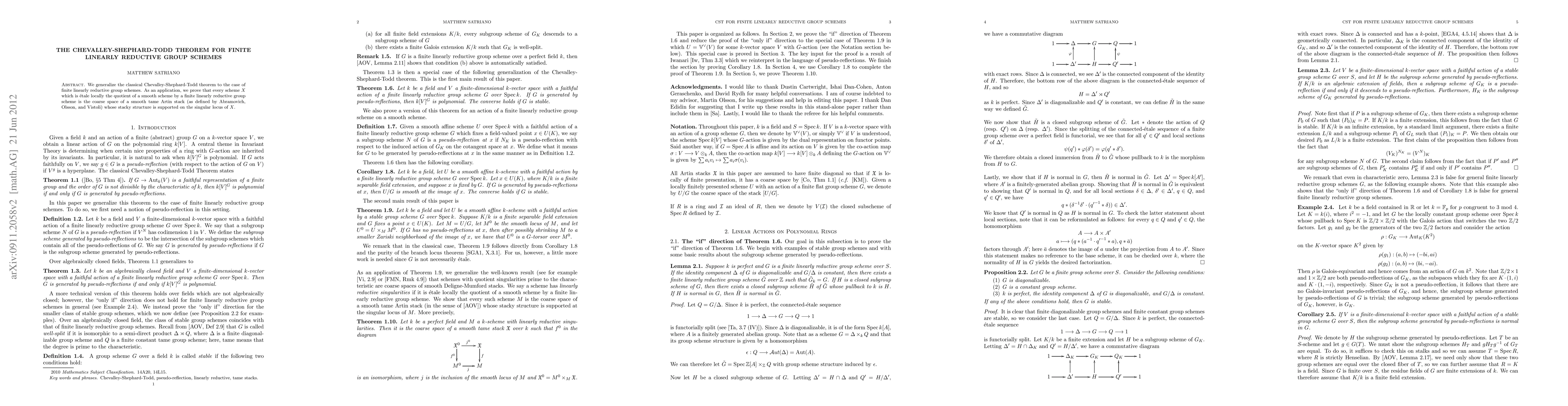 The paper generalizes the Chevalley-Shephard-Todd theorem to finite linearly reductive group schemes, demonstrating that certain etale quotients are coarse spaces of smooth tame Artin stacks with stacky structure on the singular locus.
