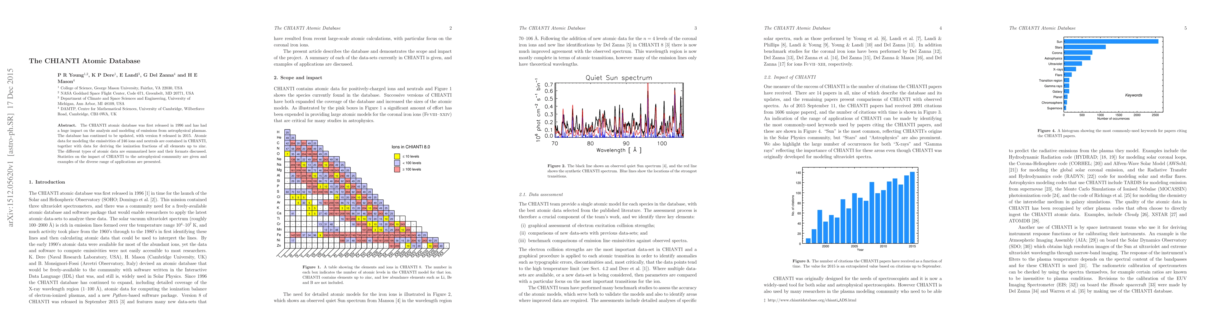 The CHIANTI atomic database, first released in 1996, provides essential atomic data for modeling astrophysical plasma emissions, with version 8 released in 2015. It includes data for 246 ions and neutrals, and ionization fractions for elements up to zinc, significantly impacting astrophysical research.