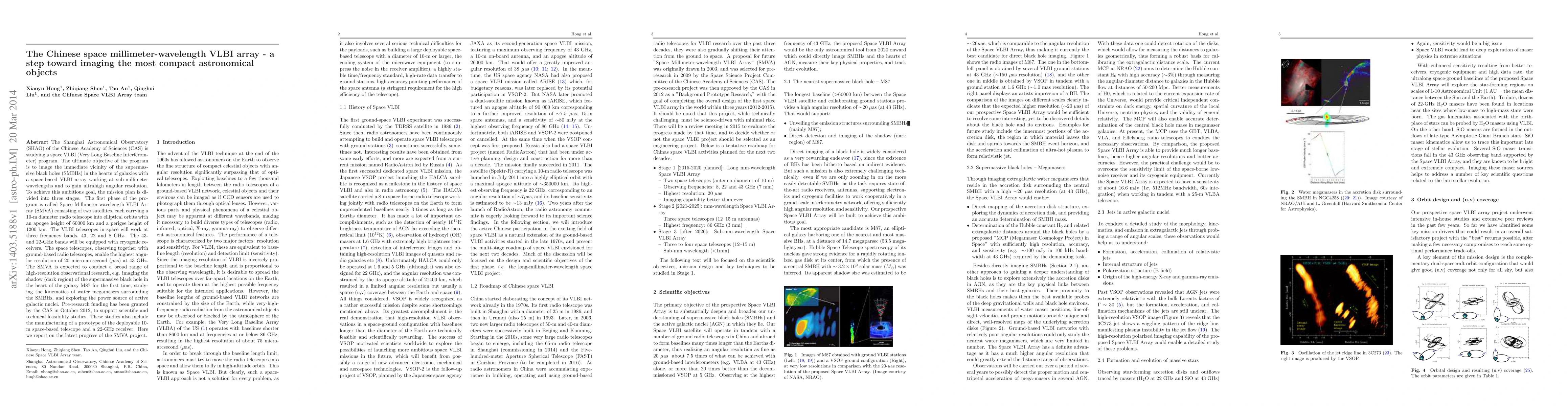 The Shanghai Astronomical Observatory (SHAO) of the Chinese Academy of Sciences (CAS) is studying a space VLBI (Very Long Baseline Interferometer) program. The ultimate objective of the program is to image the immediate vicinity of the supermassive black holes (SMBHs) in the hearts of galaxies with a space-based VLBI array working at sub-millimeter wavelengths and to gain ultrahigh angular resolution. To achieve this ambitious goal, the mission plan is divided into three stages. The first phase of the program is called Space Millimeter-wavelength VLBI Array (SMVA) consisting of two satellites, each carrying a 10-m diameter radio telescope into elliptical orbits with an apogee height of 60000 km and a perigee height of 1200 km. The VLBI telescopes in space will work at three frequency bands, 43, 22 and 8 GHz. The 43- and 22-GHz bands will be equipped with cryogenic receivers. The space telescopes, observing together with ground-based radio telescopes, enable the highest angular resolution of 20 micro-arcsecond ($\mu$as) at 43 GHz. The SMVA is expected to conduct a broad range of high-resolution observational research, e.g. imaging the shadow (dark region) of the supermassive black hole in the heart of the galaxy M87 for the first time, studying the kinematics of water megamasers surrounding the SMBHs, and exploring the power source of active galactic nuclei. Pre-research funding has been granted by the CAS in October 2012, to support scientific and technical feasibility studies. These studies also include the manufacturing of a prototype of the deployable 10-m space-based telescope and a 22-GHz receiver. Here we report on the latest progress of the SMVA project.