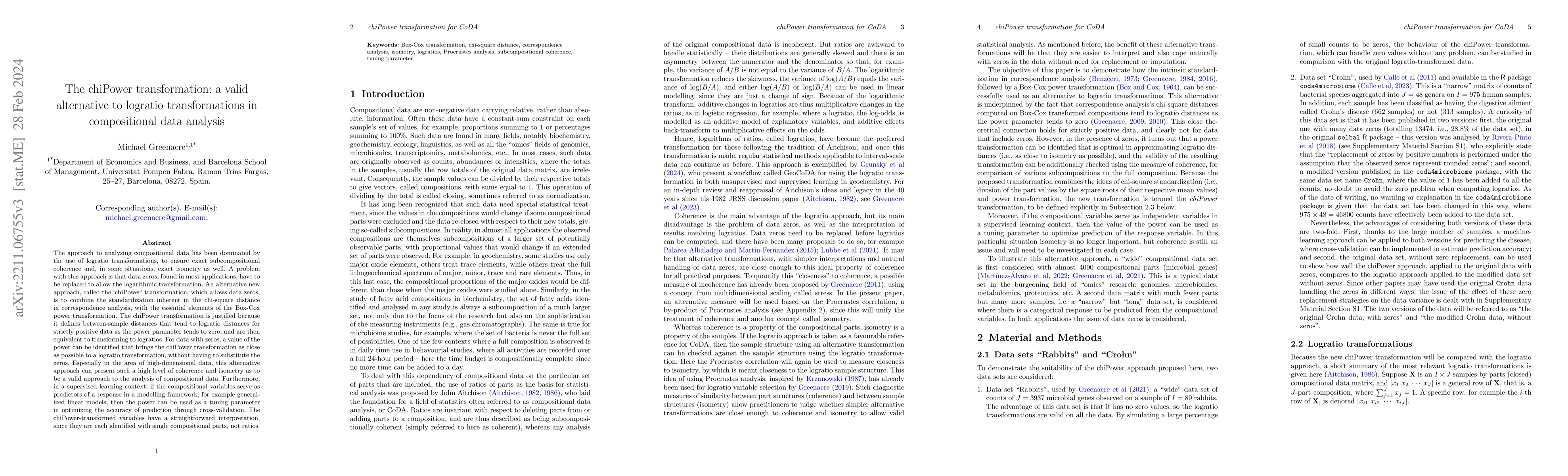 The paper proposes the chiPower transformation, a new approach for compositional data analysis that combines Box-Cox-style power transformation with chi-square standardization from correspondence analysis. It allows for data zeros, unlike log-ratio transformations, and offers flexibility through the choice of the power parameter.