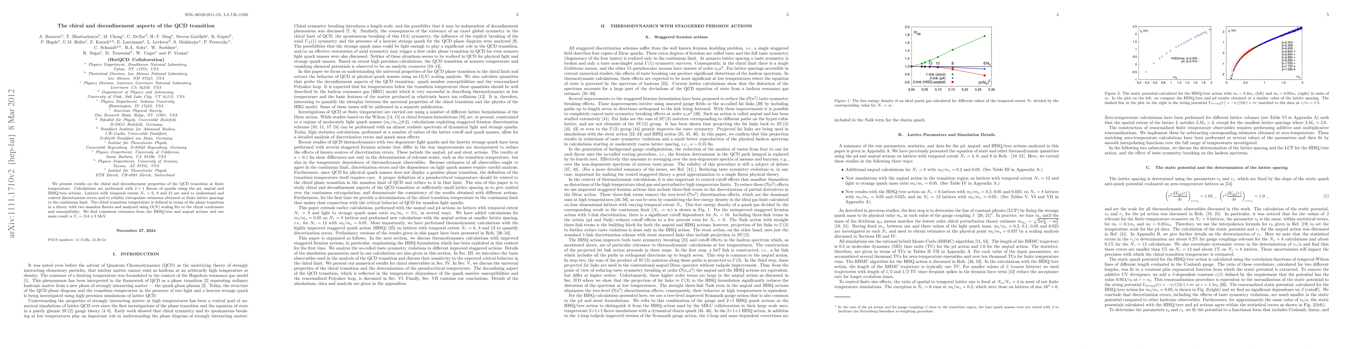 This study investigates the chiral and deconfinement properties of the QCD transition at finite temperature using 2+1 flavors of quarks. The research finds consistent estimates for the chiral transition temperature, concluding T_c=154 +/- 9 MeV, through calculations with various lattice actions and extrapolations to the continuum limit.