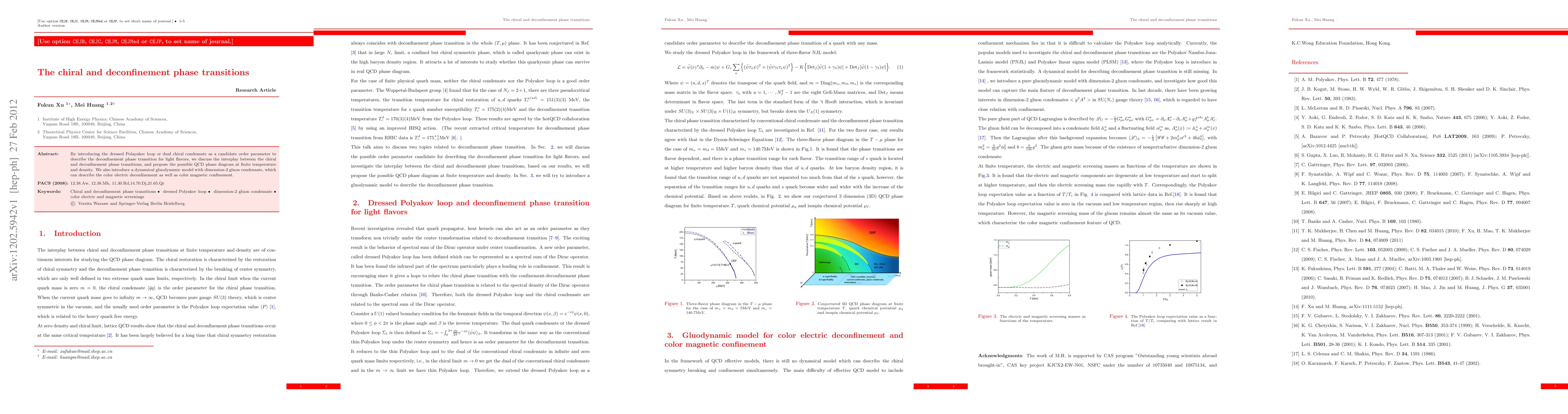 This paper explores the relationship between chiral and deconfinement phase transitions in Quantum Chromodynamics (QCD) using the dressed Polyakov loop as an order parameter. It proposes a QCD phase diagram at finite temperature and density, incorporating a gluodynamic model to describe color electric deconfinement and magnetic confinement.