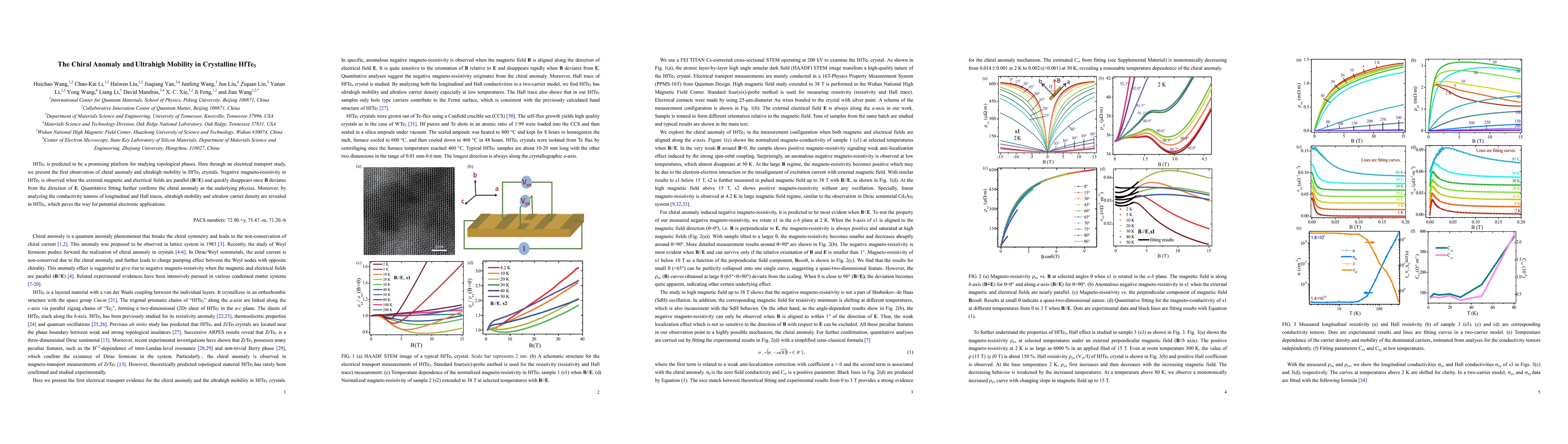 HfTe5 is predicted to be a promising platform for studying topological phases. Here through an electrical transport study, we present the first observation of chiral anomaly and ultrahigh mobility in HfTe5 crystals. Negative magneto-resistivity in HfTe5 is observed when the external magnetic and electrical fields are parallel (B//E) and quickly disappears once B deviates from the direction of E. Quantitative fitting further confirms the chiral anomaly as the underlying physics. Moreover, by analyzing the conductivity tensors of longitudinal and Hall traces, ultrahigh mobility and ultralow carrier density are revealed in HfTe5, which paves the way for potential electronic applications.