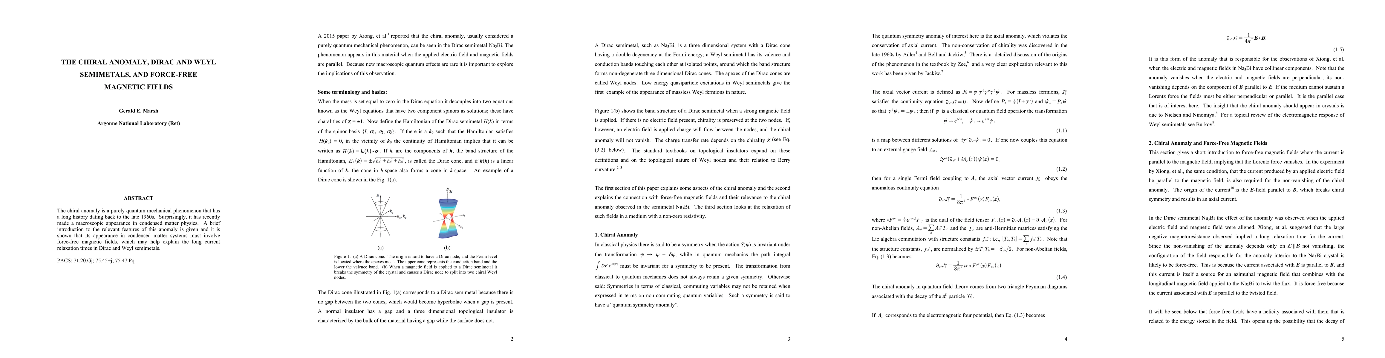 Summary: This paper explores the chiral anomaly, a quantum phenomenon, and its recent manifestation in condensed matter physics, particularly in Dirac and Weyl semimetals, attributing the long current relaxation times to the presence of force-free magnetic fields.