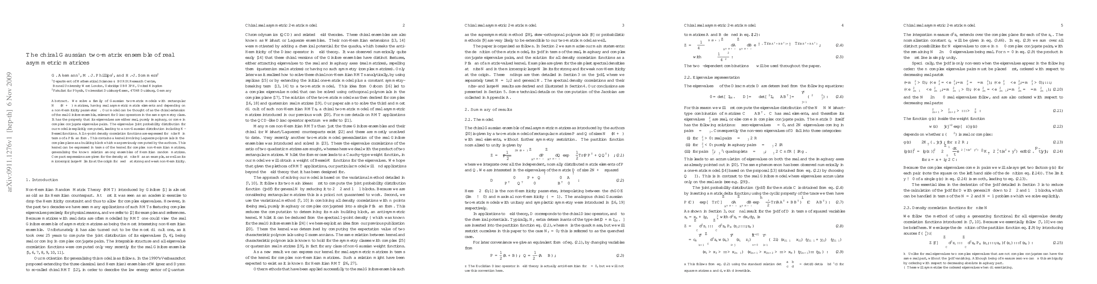 This paper solves the chiral Gaussian two-matrix ensemble of real asymmetric matrices, deriving the eigenvalue joint probability distribution and n-point density correlation functions. The results include a non-Gaussian distribution involving K-Bessel functions and a Pfaffian form with a kernel based on Laguerre polynomials.