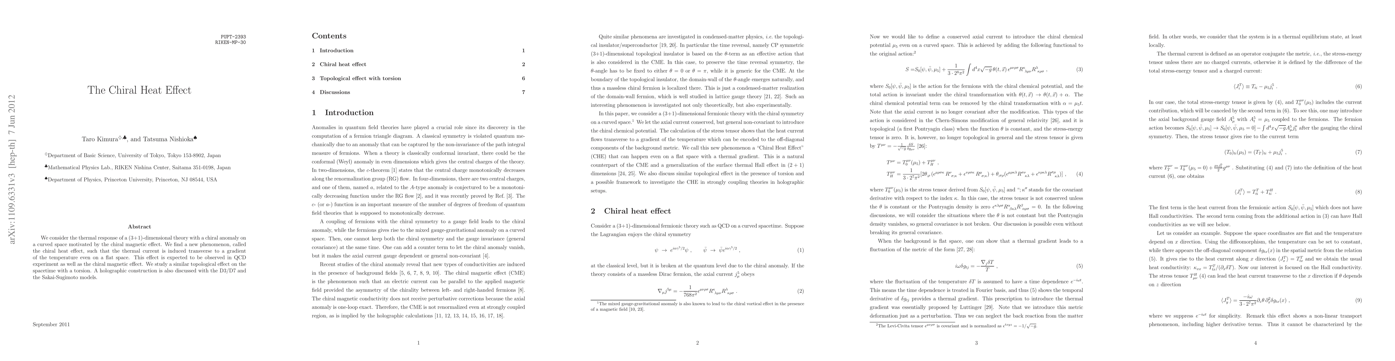 The paper explores a new thermal phenomenon, the chiral heat effect, where a thermal current is generated perpendicular to a temperature gradient in a (3+1)-dimensional theory with a chiral anomaly, even on flat space. This effect is analogous to the chiral magnetic effect and is expected to be observable in QCD experiments.