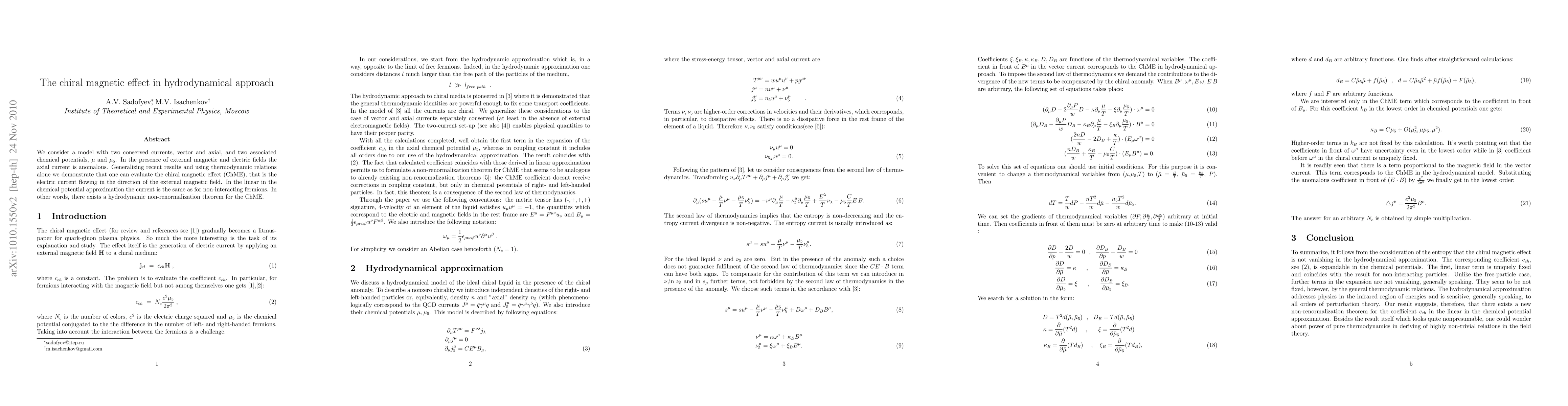 This paper investigates the chiral magnetic effect in a hydrodynamical framework, showing how a nonzero chirality induced by the chiral anomaly in quark-gluon plasma can generate an electromagnetic current along a magnetic field. A hydrodynamical model for a chiral liquid with distinct left and right-handed particle currents is utilized to explore this phenomenon.