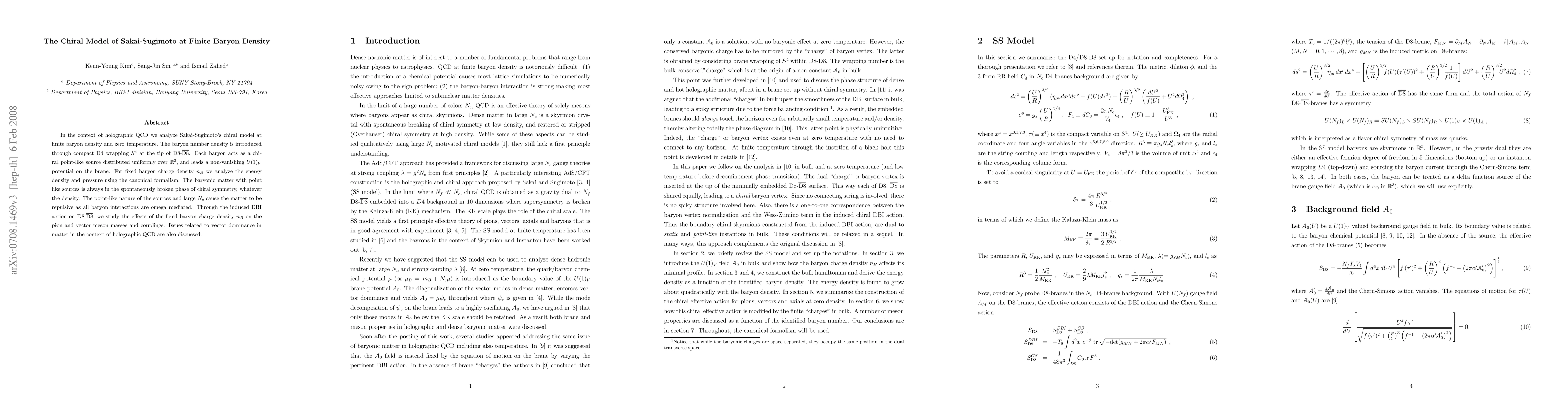 In the context of holographic QCD we analyze Sakai-Sugimoto's chiral model at finite baryon density and zero temperature. The baryon number density is introduced through compact D4 wrapping S^4 at the tip of D8-\bar{D8}. Each baryon acts as a chiral point-like source distributed uniformly over R^3, and leads a non-vanishing U(1)_V potential on the brane. For fixed baryon charge density n_B we analyze the bulk energy density and pressure using the canonical formalism. The baryonic matter with point like sources is always in the spontaneously broken phase of chiral symmetry, whatever the density. The point-like nature of the sources and large N_c cause the matter to be repulsive as all baryon interactions are omega mediated. Through the induced DBI action on D8-\bar{D8}, we study the effects of the fixed baryon charge density n_B on the pion and vector meson masses and couplings. Issues related to vector dominance in matter in the context of holographic QCD are also discussed.