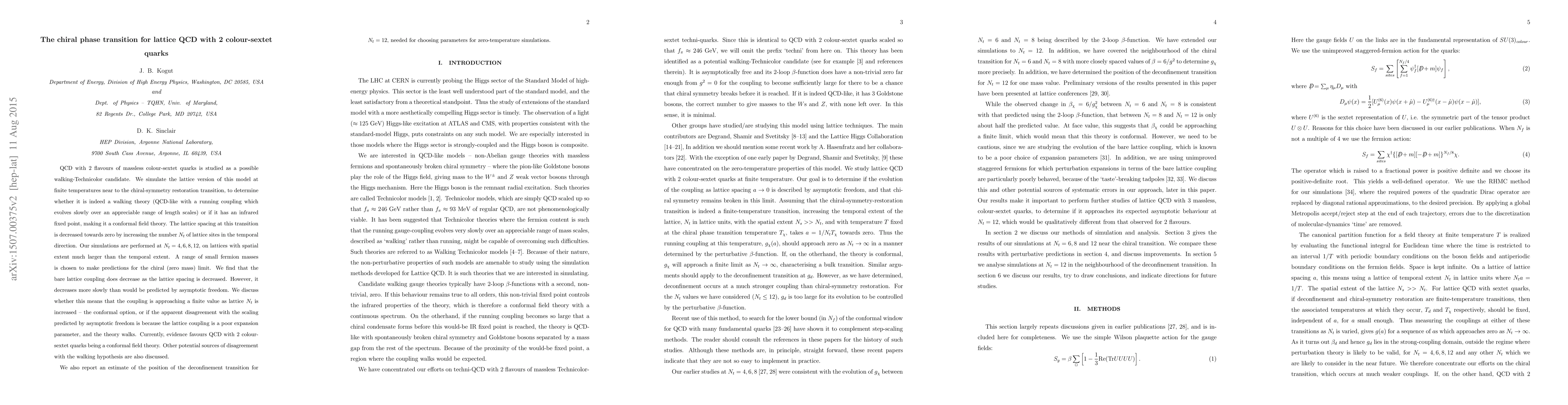 QCD with 2 flavours of massless colour-sextet quarks is studied as a possible walking-Technicolor candidate. We simulate the lattice version of this model at finite temperatures near to the chiral-symmetry restoration transition, to determine whether it is indeed a walking theory (QCD-like with a running coupling which evolves slowly over an appreciable range of length scales) or if it has an infrared fixed point, making it a conformal field theory. The lattice spacing at this transition is decreased towards zero by increasing the number $N_t$ of lattice sites in the temporal direction. Our simulations are performed at $N_t=4,6,8,12$, on lattices with spatial extent much larger than the temporal extent. A range of small fermion masses is chosen to make predictions for the chiral (zero mass) limit. We find that the bare lattice coupling does decrease as the lattice spacing is decreased. However, it decreases more slowly than would be predicted by asymptotic freedom. We discuss whether this means that the coupling is approaching a finite value as lattice $N_t$ is increased -- the conformal option, or if the apparent disagreement with the scaling predicted by asymptotic freedom is because the lattice coupling is a poor expansion parameter, and the theory walks. Currently, evidence favours QCD with 2 colour-sextet quarks being a conformal field theory. Other potential sources of disagreement with the walking hypothesis are also discussed. We also report an estimate of the position of the deconfinement transition for $N_t=12$, needed for choosing parameters for zero-temperature simulations.