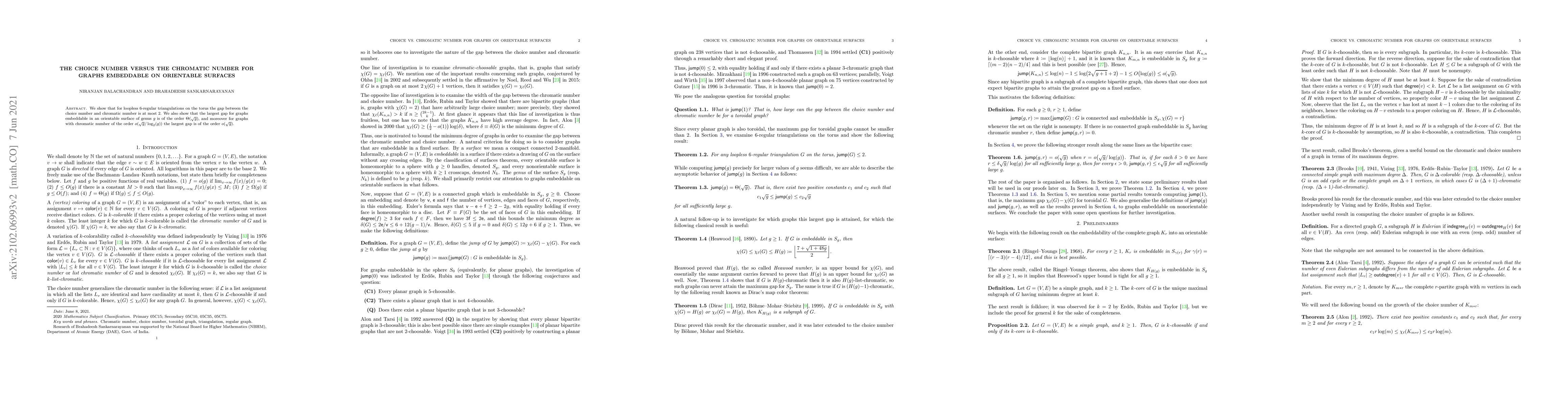 Summary: The paper demonstrates that for 6-regular triangulations on the torus, the difference between the choice number and chromatic number is at most 2. It also establishes that for graphs embeddable on orientable surfaces of genus g, the largest gap between these numbers is proportional to √g, and for lower chromatic numbers, this gap diminishes accordingly.