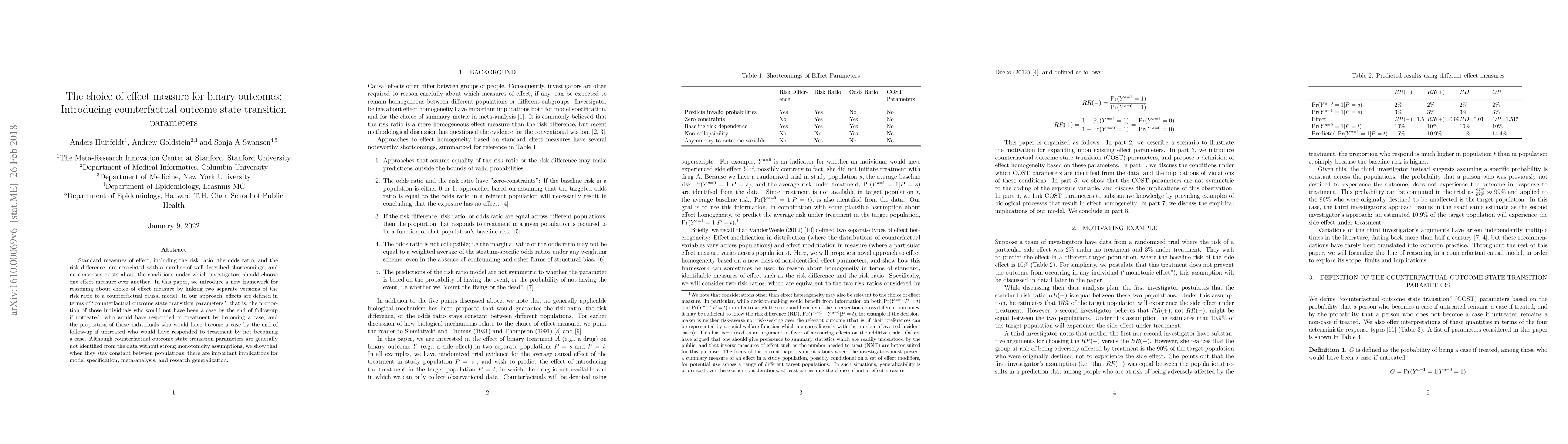 Researchers introduce a new framework for choosing effect measures in binary outcomes by linking risk ratios to counterfactual causal models, providing implications for model specification and research generalization when transition parameters stay constant between populations.