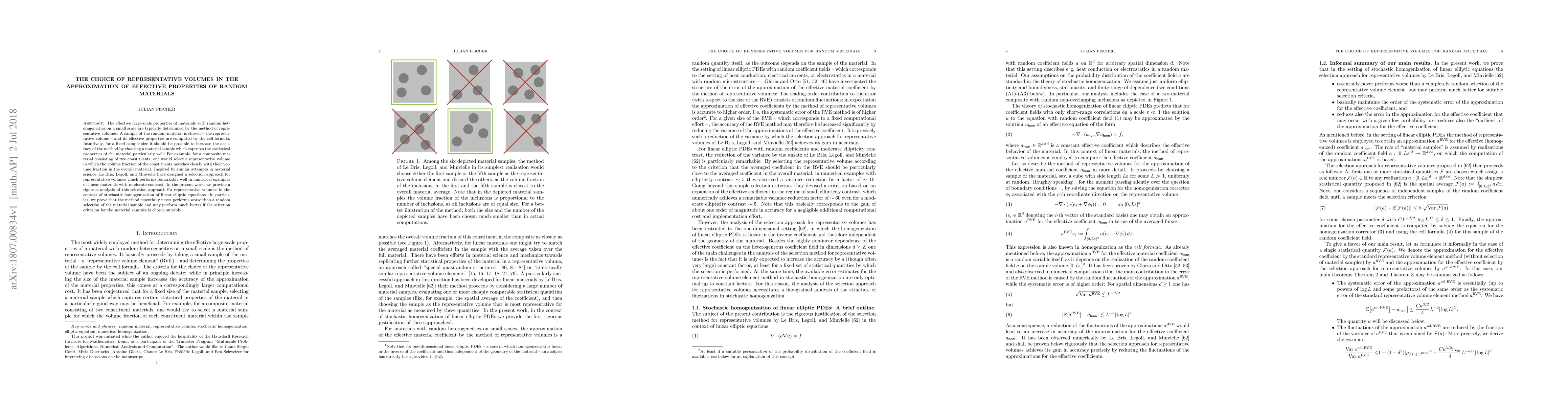The effective large-scale properties of materials with random heterogeneities on a small scale are typically determined by the method of representative volumes: A sample of the random material is chosen - the representative volume - and its effective properties are computed by the cell formula. Intuitively, for a fixed sample size it should be possible to increase the accuracy of the method by choosing a material sample which captures the statistical properties of the material particularly well: For example, for a composite material consisting of two constituents, one would select a representative volume in which the volume fraction of the constituents matches closely with their volume fraction in the overall material. Inspired by similar attempts in material science, Le Bris, Legoll, and Minvielle have designed a selection approach for representative volumes which performs remarkably well in numerical examples of linear materials with moderate contrast. In the present work, we provide a rigorous analysis of this selection approach for representative volumes in the context of stochastic homogenization of linear elliptic equations. In particular, we prove that the method essentially never performs worse than a random selection of the material sample and may perform much better if the selection criterion for the material samples is chosen suitably.