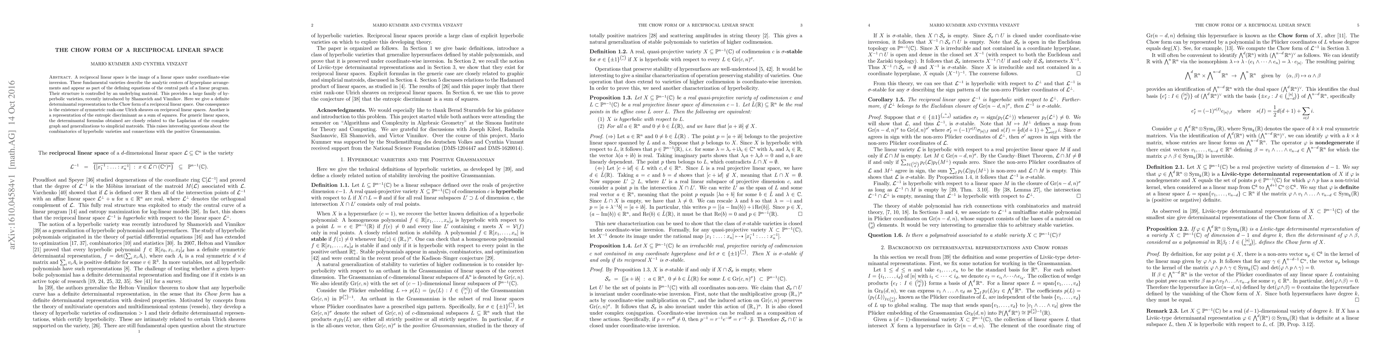 A reciprocal linear space is the image of a linear space under coordinate-wise inversion. These fundamental varieties describe the analytic centers of hyperplane arrangements and appear as part of the defining equations of the central path of a linear program. Their structure is controlled by an underlying matroid. This provides a large family of hyperbolic varieties, recently introduced by Shamovich and Vinnikov. Here we give a definite determinantal representation to the Chow form of a reciprocal linear space. One consequence is the existence of symmetric rank-one Ulrich sheaves on reciprocal linear spaces. Another is a representation of the entropic discriminant as a sum of squares. For generic linear spaces, the determinantal formulas obtained are closely related to the Laplacian of the complete graph and generalizations to simplicial matroids. This raises interesting questions about the combinatorics of hyperbolic varieties and connections with the positive Grassmannian.
