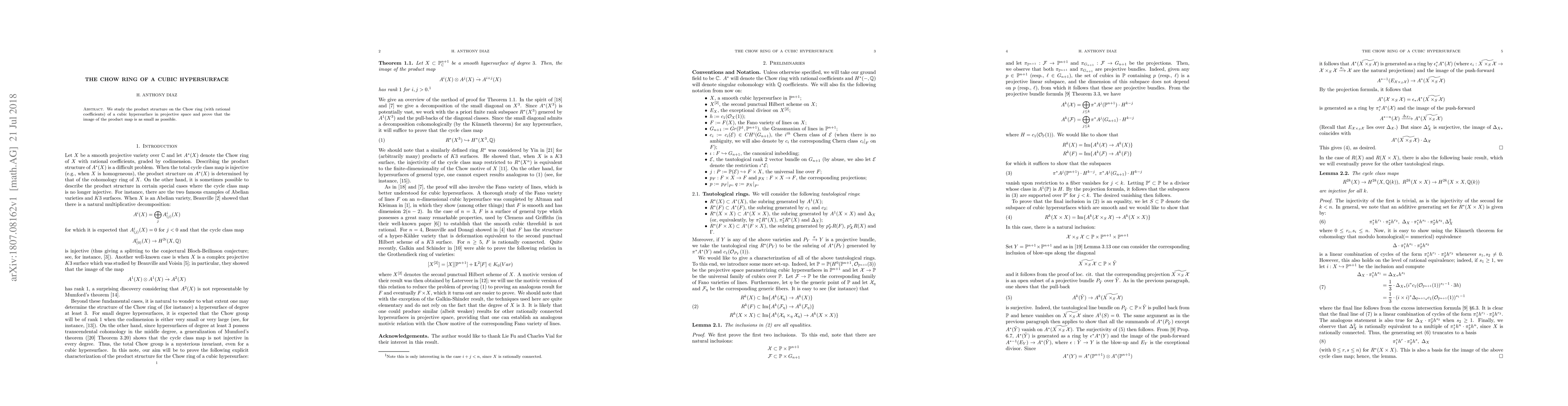 Researchers studied the product structure on the Chow ring of a cubic hypersurface in projective space, finding that its image is as small as possible.