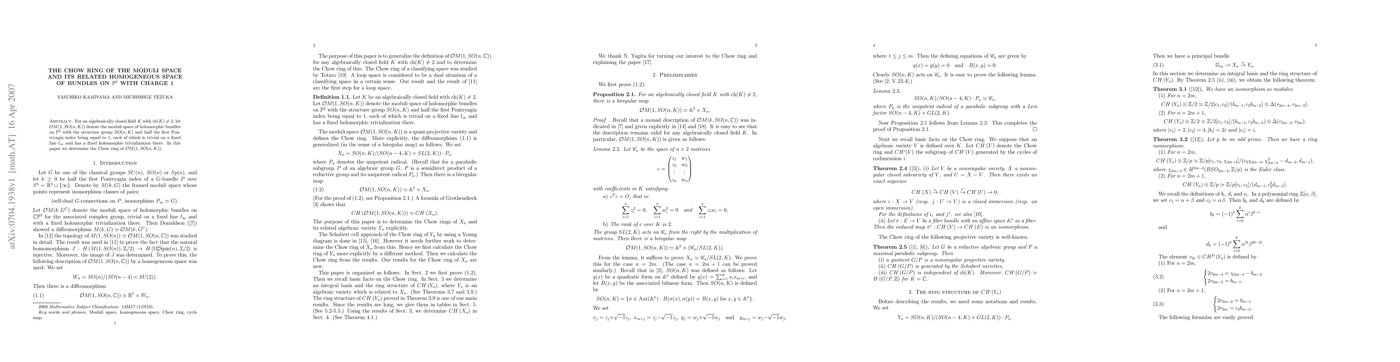 For an algebraically closed field K with ch K \not = 2, we determine the Chow ring of the moduli space of holomorphic bundles on a projective plane with the structure group SO(n,K) and half the first Pontryagin index being equal to 1, each of which is trivial on a fixed line and has a fixed holomorphic trivialization there.