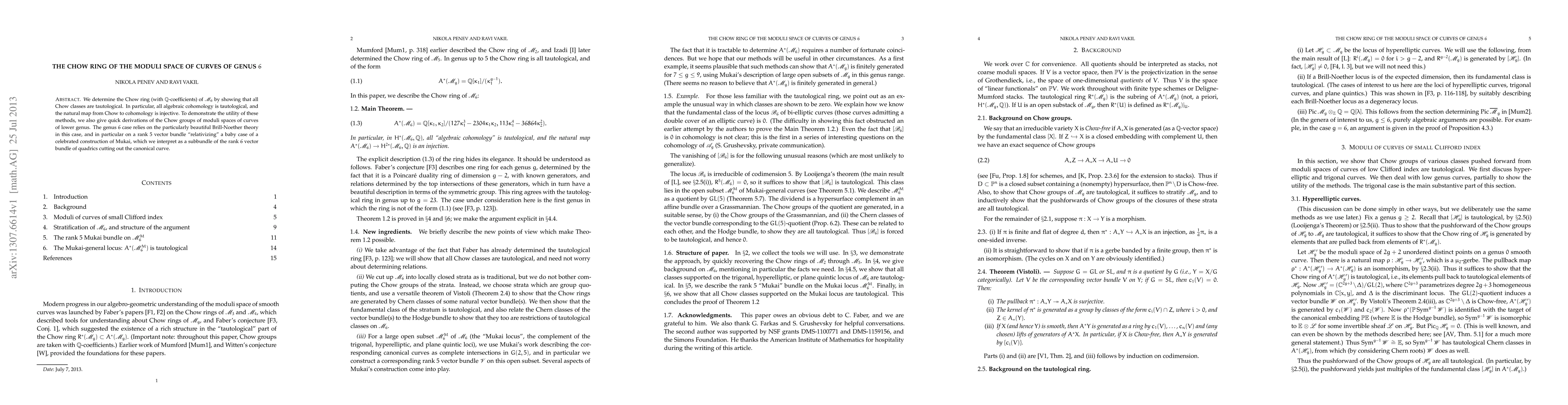 The paper determines the Chow ring of the moduli space M_6 of genus 6 curves, showing all Chow classes are tautological with Q-coefficients and that the natural map from Chow to cohomology is injective. The work utilizes Brill-Noether theory and a specific vector bundle construction by Mukai to demonstrate these results.