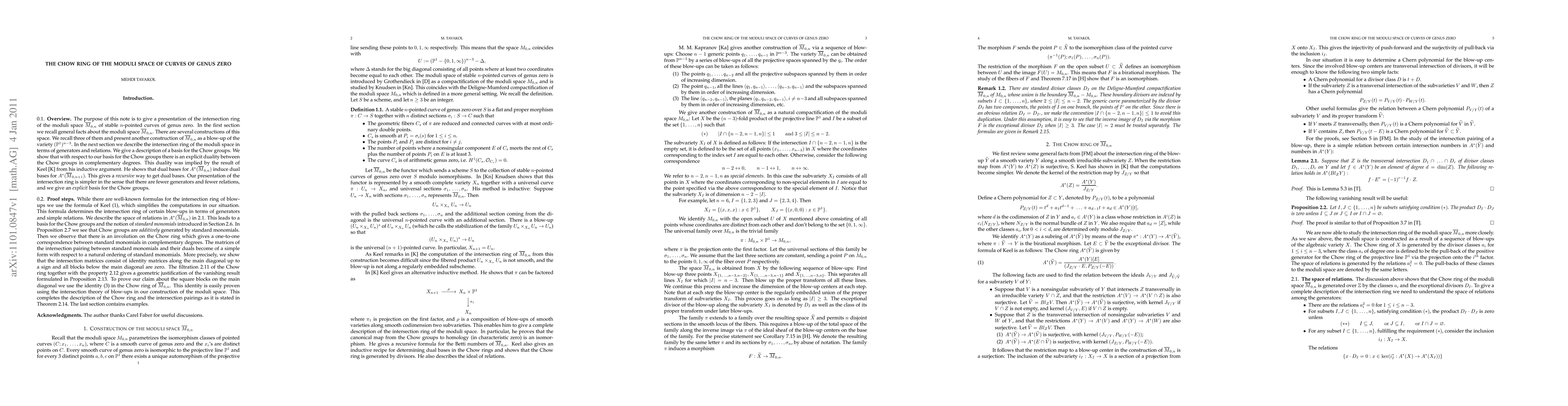After recalling several constructions of the moduli space of curves of genus zero by different people we give our alternative construction of the moduli space. This gives a simple description of the intersection ring of this space. We give a basis for the Chow groups and an explicit duality between the Chow groups in complementary degrees. There is a recursive description of this algebra by S. Keel. Our presentation is simpler in the sense that there are fewer generators and fewer relations and our description is explicit.