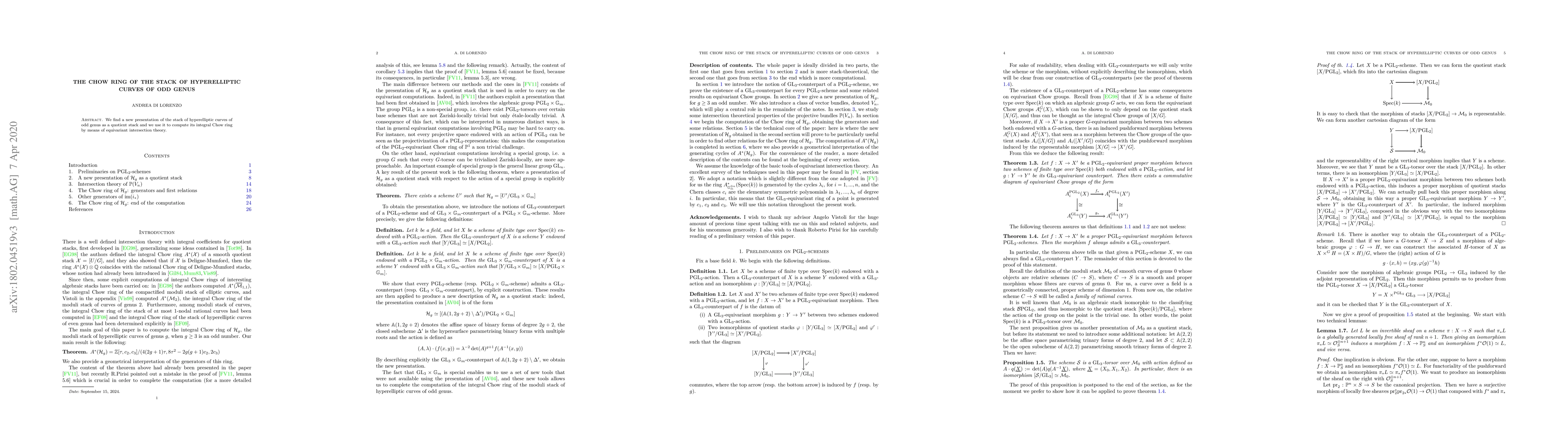 This paper presents a new quotient stack description for the stack of hyperelliptic curves of odd genus and computes its integral Chow ring using equivariant intersection theory. The findings provide a novel perspective on the structure of this mathematical object.