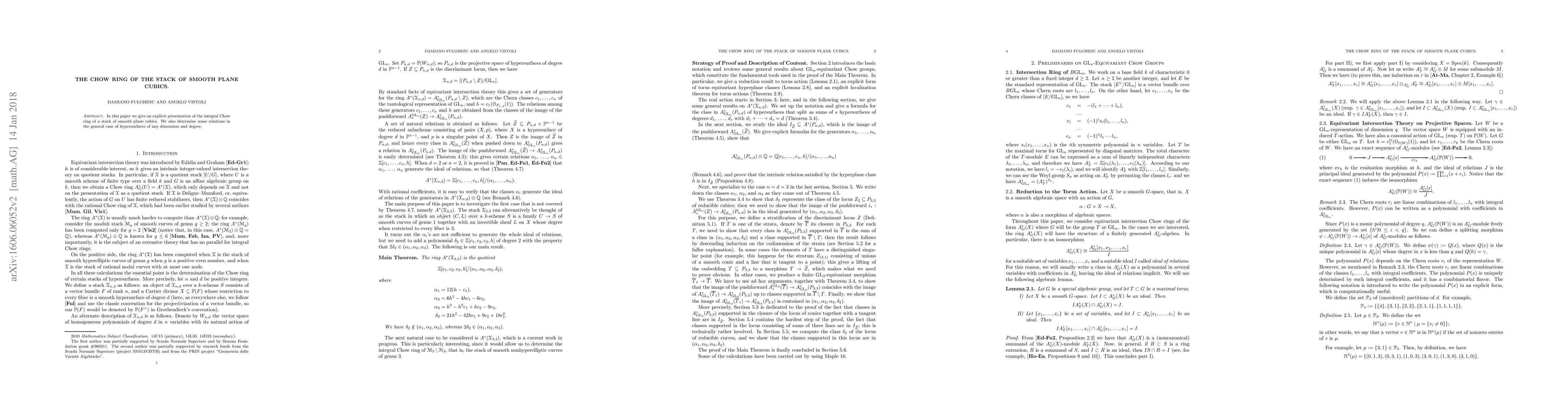 This paper presents an explicit description of the integral Chow ring for the stack of smooth plane cubics and identifies relations applicable to hypersurfaces of any dimension and degree. The results provide deeper insights into the geometric structures underlying these algebraic varieties.