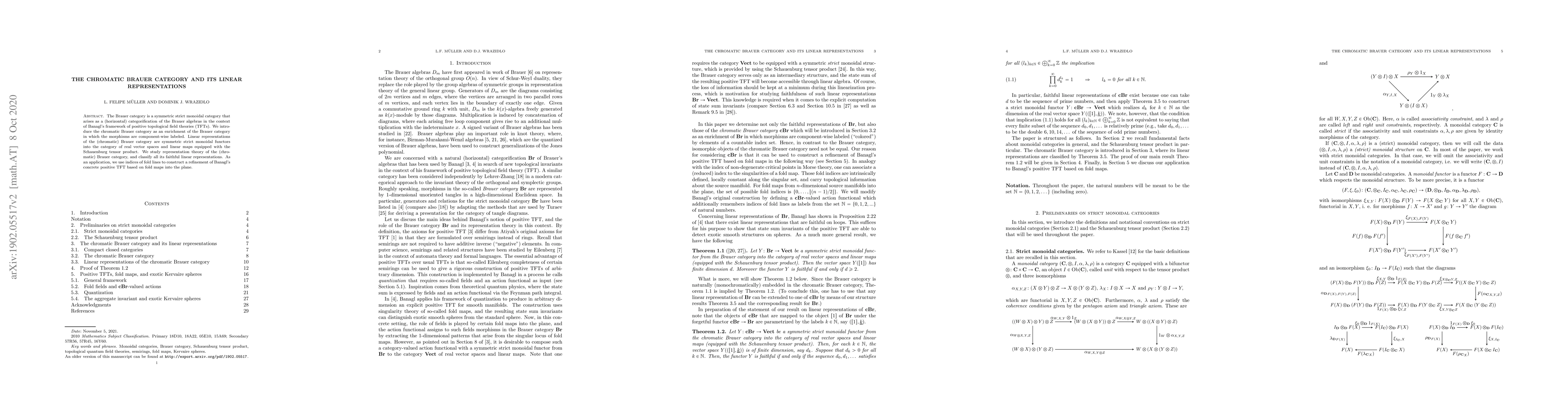 The paper introduces the chromatic Brauer category as a categorification of Brauer algebras within Banagl's positive topological field theories framework, and classifies its faithful linear representations. It applies these representations to refine Banagl's positive TFT using indices of fold lines.