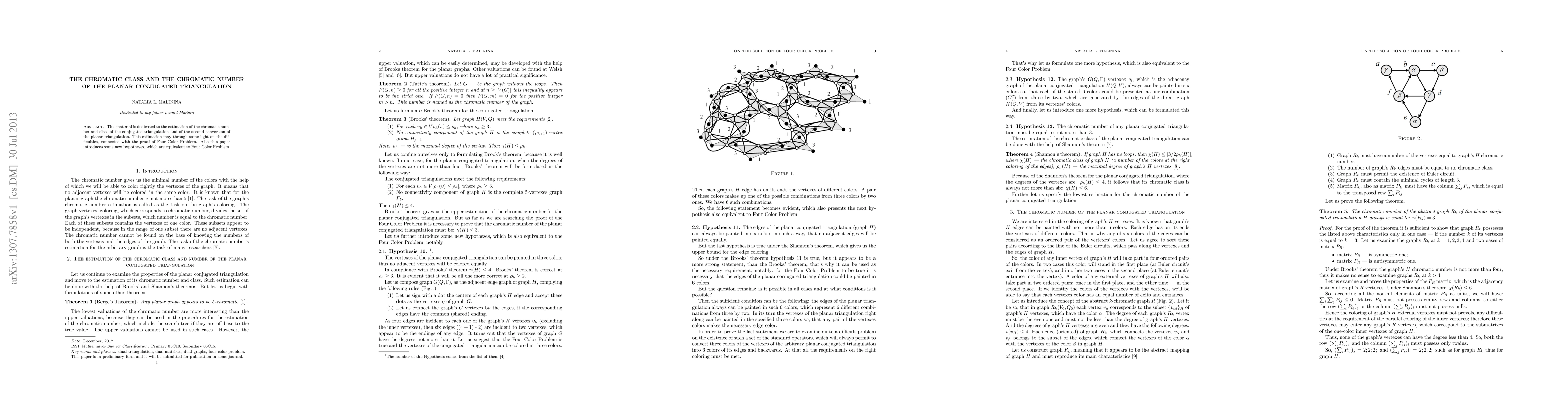 This material is dedicated to the estimation of the chromatic number and chromatic class of the conjugated triangulation (first conversion) and also of the second conversion of the planar triangulation. Also this paper introduces some new hypotheses, which are equivalent to Four Color Problem.