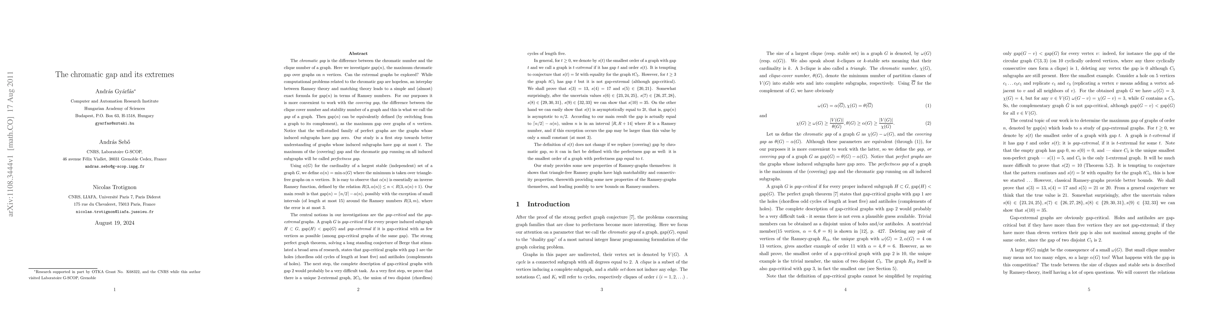 This paper investigates the chromatic gap, the difference between a graph's chromatic number and its clique number, and explores the maximum gap $\gap(n)$ for graphs with $n$ vertices. It proposes a formula for $\gap(n)$ using Ramsey theory and matching theory, despite computational challenges.